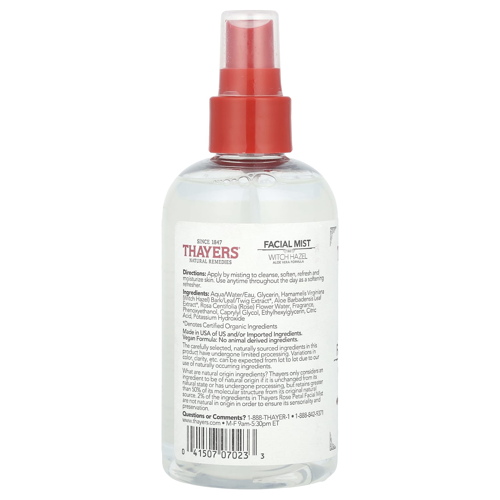 Какие ингредиенты натурального происхождения? Компания Thayers считает ингредиент натуральным только в том случае, если он не изменился по сравнению с его естественным состоянием или прошел обработку, но сохранил более 50% своей молекулярной структуры из исходного природного источника. 2% ингредиентов в спрее для лица с лепестками роз от Thayers имеют ненатуральное происхождение, чтобы обеспечить его чувственность и сохранность.