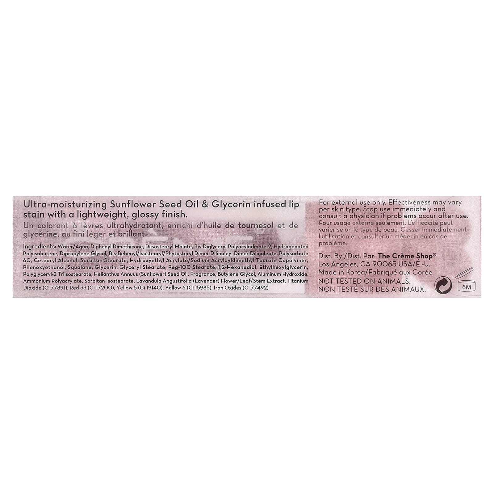 Ультраувлажняющий краситель для губ, содержащий подсолнечное масло и глицерин, с легким глянцевым финишем.
