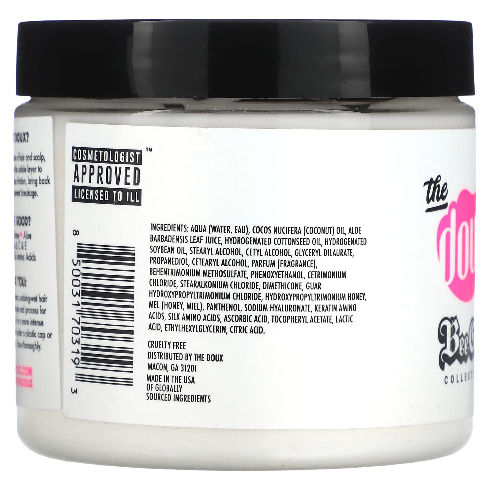Aqua (вода, eau), кокосовое масло (Cocos nucifera), сок листьев алоэ вера (Aloe barbadensis), гидрогенизированное хлопковое масло, гидрогенизированное соевое масло, стеариловый спирт, цетиловый спирт, глицерил дилаурат, пропандиол, цетеариловый спирт, отдушка, метосульфат бегентримония, феноксиэтанол, цетримония хлорид, хлорид стеаралкония, диметикон, гуар гидроксипропилтримония хлорид, гидроксипропилтримониальный мед, мел, миэль), пантенол, гиалуронат натрия, аминокислоты кератина, аминокислоты шелка, аскорбиновая кислота, токоферилацетат, молочная кислота, этилгексилглицерин, лимонная кислота.