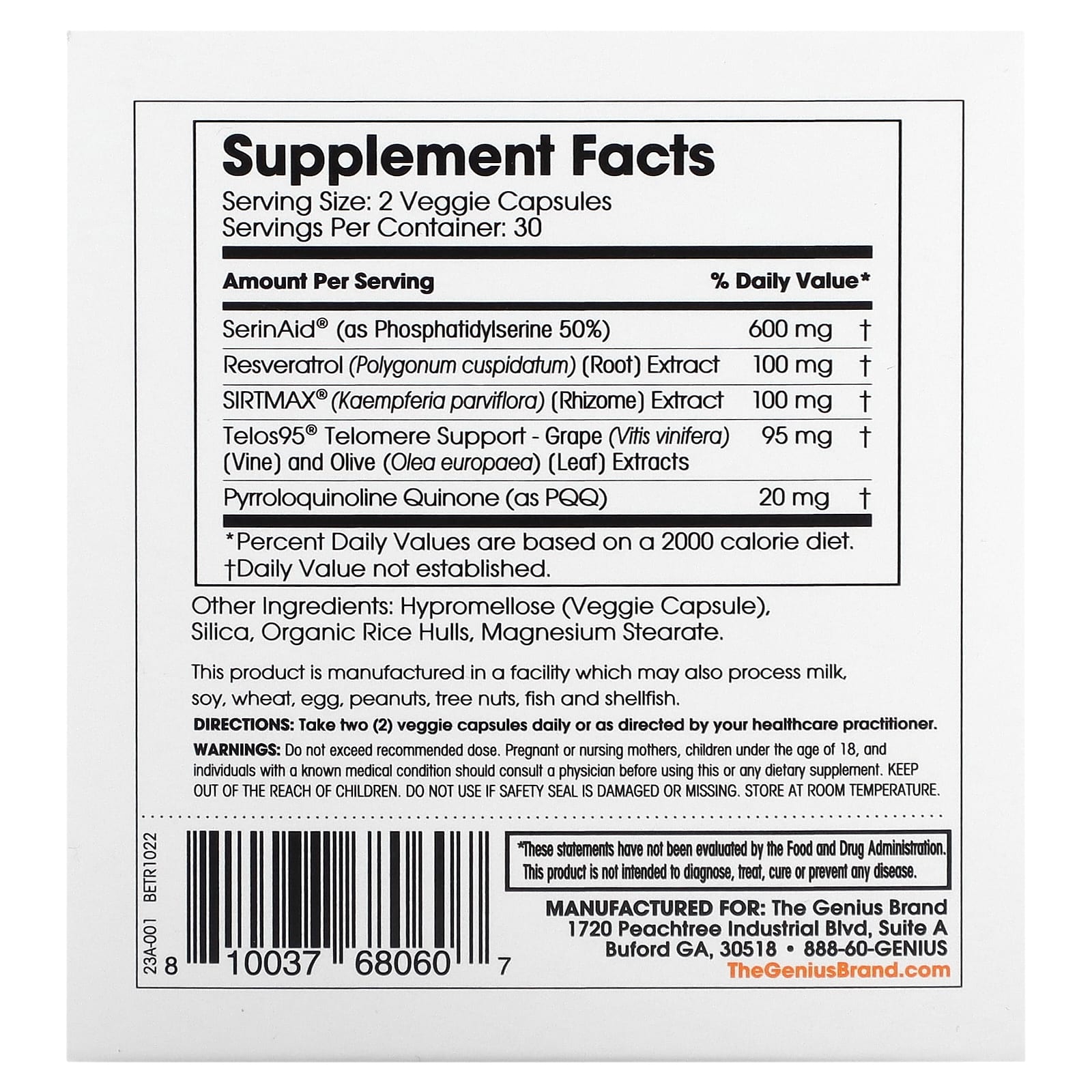 Внутри каждой нашей клетки есть буквально биологические часы, называемые теломерами, которые способствуют здоровому размножению клеток. Со временем эти теломеры становятся меньше из-за повреждения свободными радикалами, стрессом и токсинами из окружающей среды*. Genius Eternal содержит Telos95®, который, как было доказано в клинических испытаниях, помогает удлинить теломеры и снизить срок службы клеток. Кроме того, в состав Genius Eternal входят SerinAid®, Sirtmax®, ресвератрол и пирролохинолинхинон. Эти ингредиенты обеспечивают поддержку когнитивных функций и памяти, поддерживают нормальный уровень глюкозы в крови, повышенный уровень антиоксидантов и стимулируют митохондриальный биогенез (генерируя больше АТФ). Революция в области биохакерства для человека — это: Раскройте в себе гения уже сегодня!
