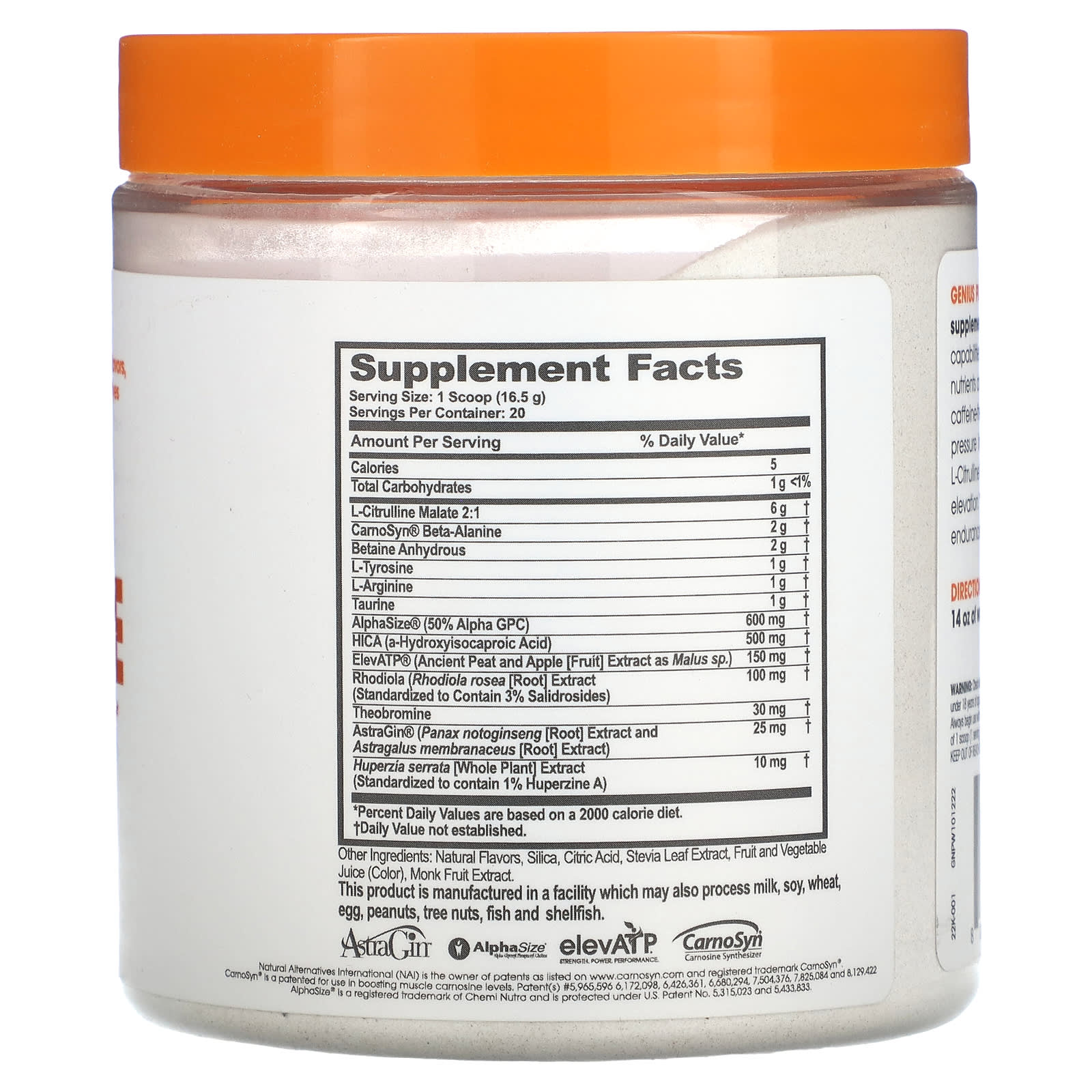 Genius Pre - это предтренировочная добавка на основе ноотропов без стимуляторов. Раскройте свой потенциал и расширьте свои возможности для достижения более высоких спортивных результатов, используя правильные питательные вещества и чистые, научно изученные ингредиенты. Не содержит кофеина, чтобы избежать сужения сосудов и повышения артериального давления в мозге. Включает клиническую дозу 6 г L-цитруллина малата, бета-аланин и АТФ для поддержки повышения уровня оксида азота. Переведите мышцы в режим накачки и поддержите выносливость, уменьшив болезненность мышц после тренировки.