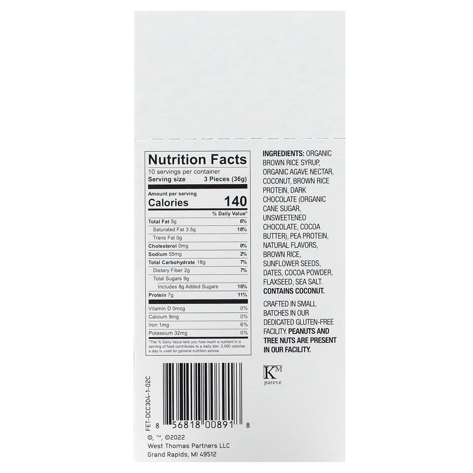 Сироп из органического коричневого риса, нектар органической агавы, кокос, протеин из коричневого риса, темный шоколад (органический тростниковый сахар, горький шоколад, какао-масло), гороховый протеин, натуральные ароматизаторы, коричневый рис, семена подсолнечника, финики, какао-порошок, льняное семя, морская соль.