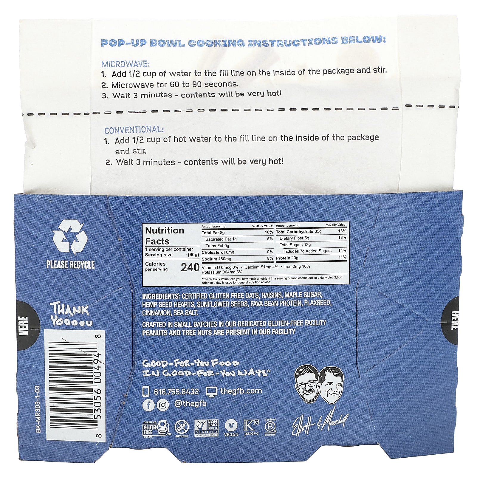Сертифицированный безглютеновый овес, изюм, кленовый сахар, сердца из семян конопли, семена подсолнечника, протеин из бобов, льняное семя, корица, морская соль.