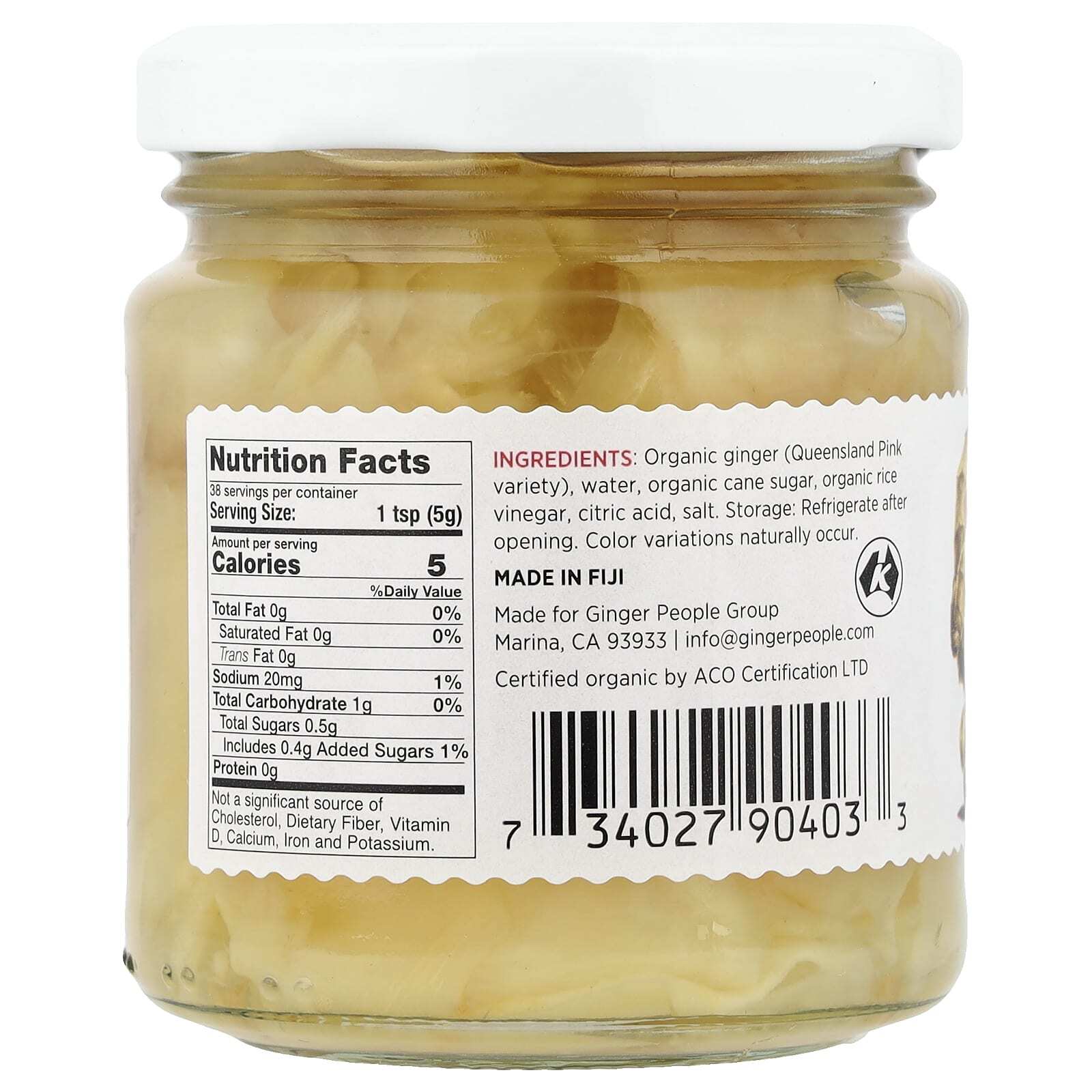 Органический имбирь (розовый сорт Квинсленда), вода, органический тростниковый сахар, органический рисовый уксус, лимонная кислота, соль.