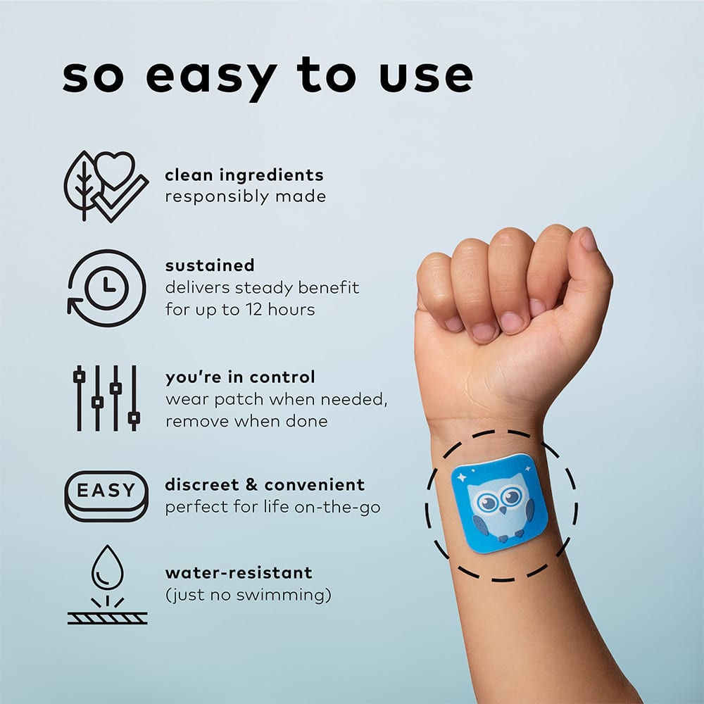Перед сном наложите патчи в виде волшебной совы на внутреннюю сторону запястья ребенка. Патч можно использовать до 12 часов. Просто снимите патчи утром.