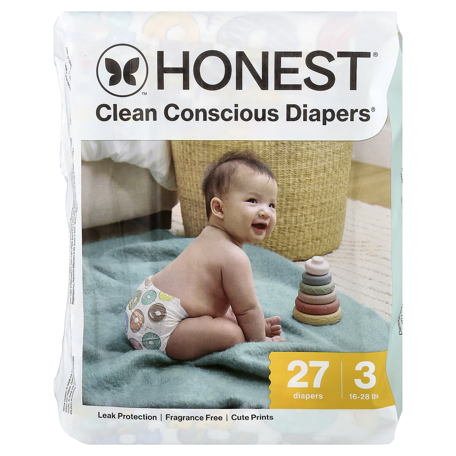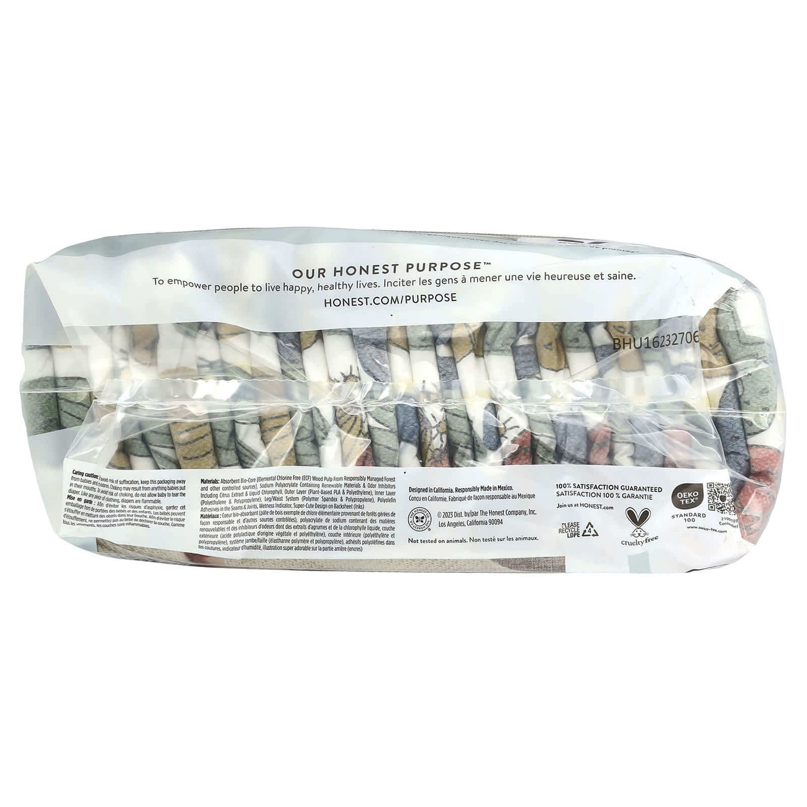 Материалы: Абсорбирующая биооснова [древесная целлюлоза без элементарного хлора, выращенная в экологически чистых лесах и из других контролируемых источников], полиакрилат натрия, содержащий ингибиторы запаха растительного происхождения, в том числе экстракт цитрусовых жидкий хлорофилл, внешний слой (полипропилен), внутренний слой (растительный слой из полиэфира и полиэтилена), система ног/талии (полимер спандекс и полипропилен), полиолефиновый клей для швов суставов, индикатор влаги, суперсимпатичный дизайн на оборотной стороне (чернила).