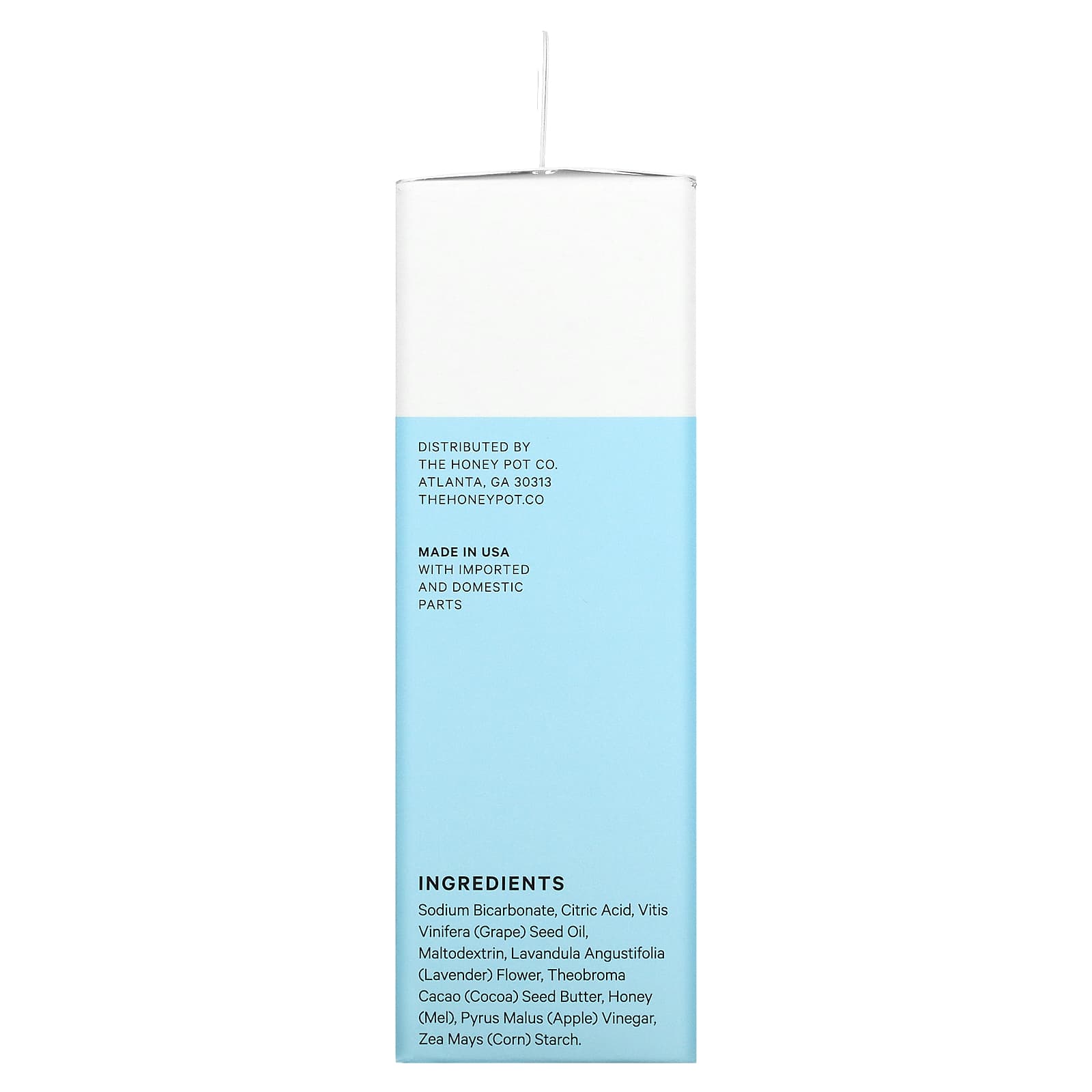Бикарбонат натрия, лимонная кислота, масло из виноградных косточек (Vitis vinifera), мальтодекстрин, масло из цветков лаванды (Lavandula angustifolia), масло зерен какао (Theobroma cacao), мед (мел), яблочный уксус (pyrus malus), кукурузный крахмал (Zea mays).