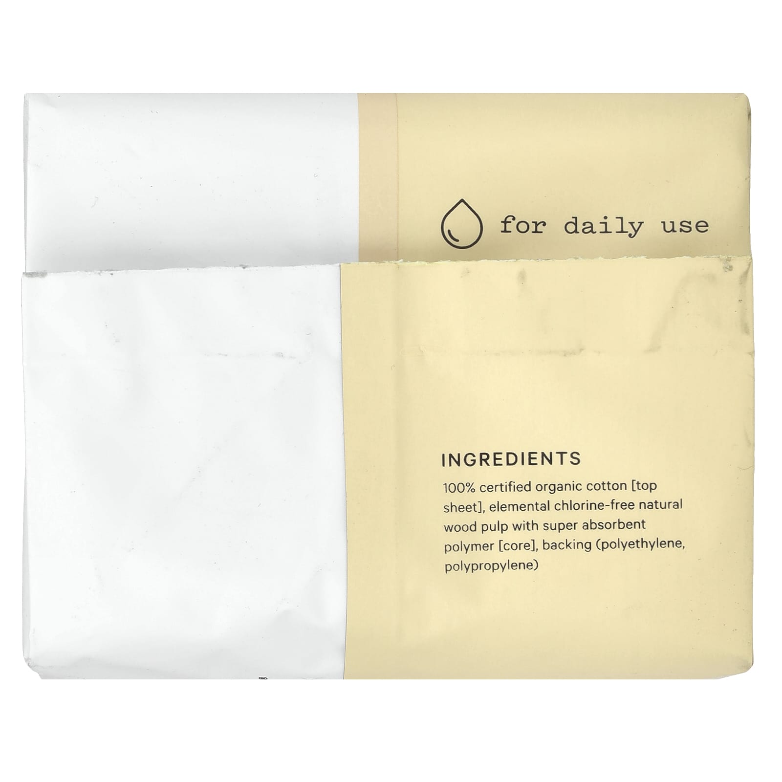 100% сертифицированный органический хлопок [верхний слой], натуральная древесная масса без элементарного хлора с супервпитывающим полимером [центральная часть], нижний слой (полиэтилен, полипропилен).