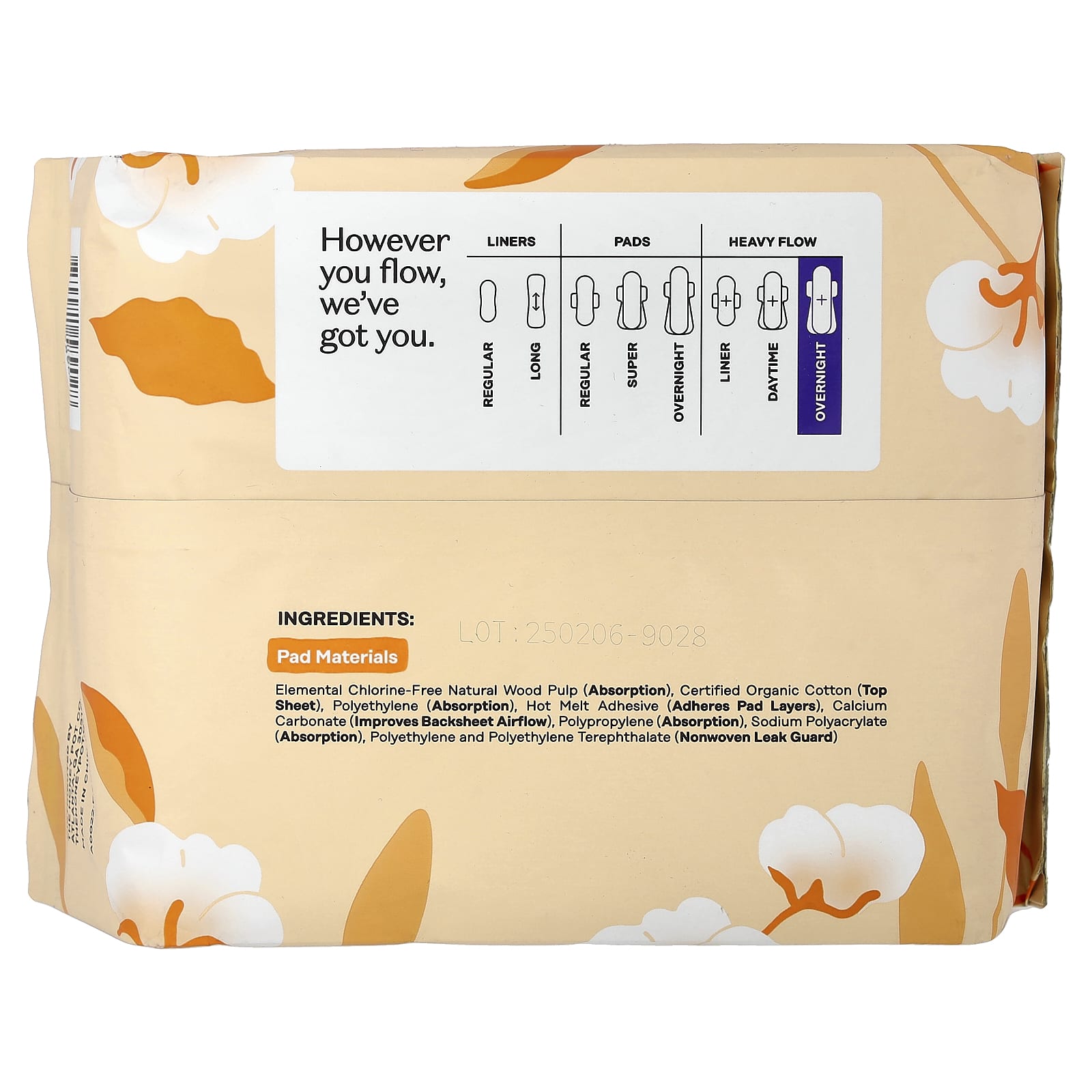 Материалы для прокладок: Натуральная древесная целлюлоза без элементарного хлора (абсорбция), сертифицированный органический хлопок (верхний слой), полиэтилен (абсорбция), клей-расплав (для приклеивания слоев прокладки), карбонат кальция (улучшает циркуляцию воздуха через тыльный слой), полипропилен (абсорбция), полиакрилат натрия (абсорбция), полиэтилен и полиэтилентерефталат (нетканый материал для защиты от протеканий).