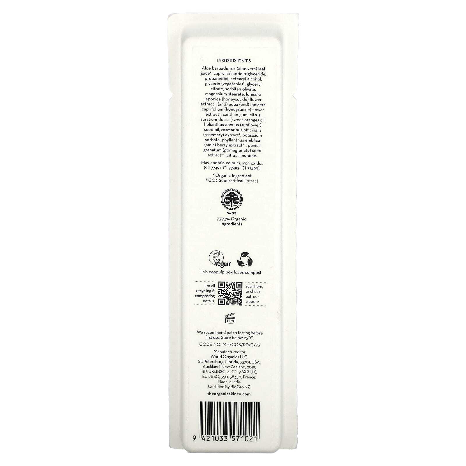 Сок листьев алоэ вера (Aloe barbadensis)*, каприловый/каприновый триглицерид, пропандиол, цетеариловый спирт, глицерин (растительный) *, глицерил цитрат, сорбитан оливат, стеарат магния, экстракт цветков жимолости японской (Lonicera japonica), экстракт цветков жимолости (и) водоросли (Lonicera caprifolium) †, ксантановая камедь, масло сладкого апельсина (Citrus auratium dulsis), подсолнечное масло (Helianthus annuus), экстракт розмарина (Rosmarinus officinalis) †, сорбат калия, экстракт ягод амлы (Phyllanthus emblica) * †, экстракт косточек граната (Punica granatum) * †, цитраль, лимонен.