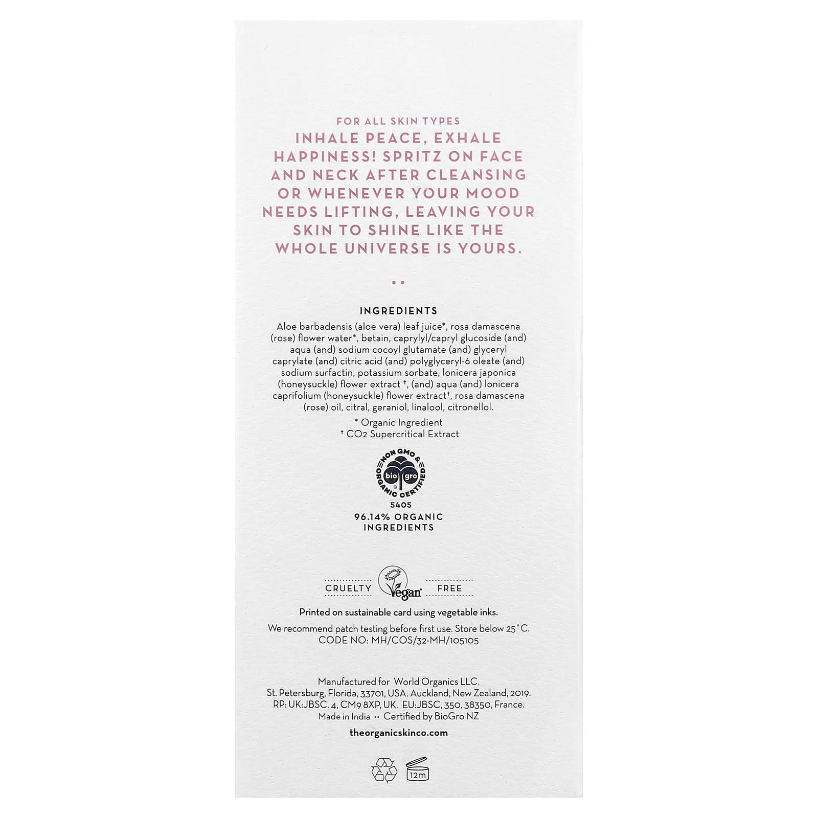Сок листьев алоэ вера (Aloe barbadensis)*, вода из цветков розы (Rosa damascena) *, бетаин, каприлил / каприл глюкозид (и) аква (и) кокоил глутамат натрия (и) глицерил каприлат (и) лимонная кислота (и) полиглицерил-6 олеат (и) сурфактин натрия, сорбат калия, экстракт цветков жимолости (Lonicera japonica) †, экстракт цветков жимолости (и) водоросли (Lonicera caprifolium) †, масло дамасской розы, цитраль, гераниол, линалоол, цитронеллола.