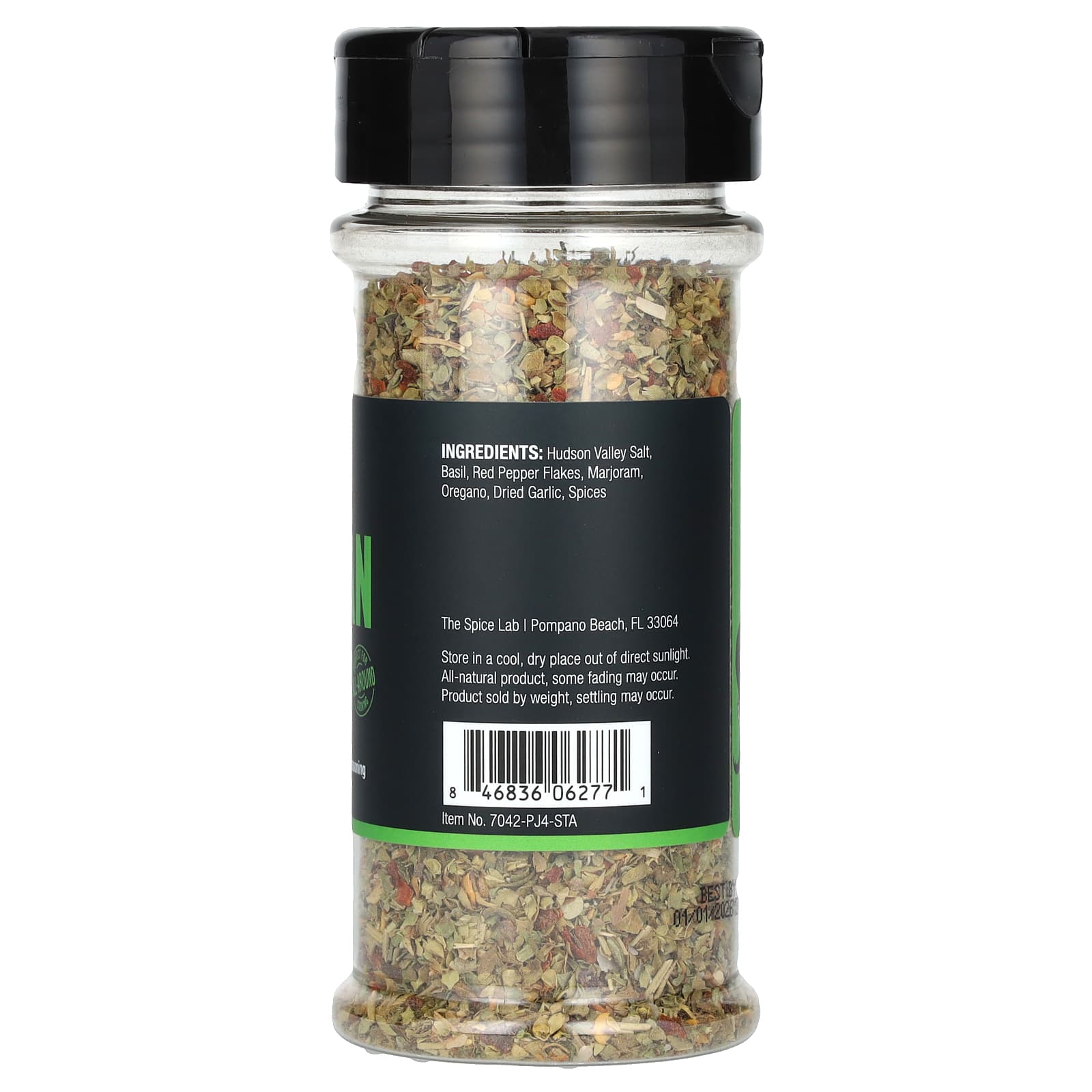 Соль из долины Гудзона, базилик, хлопья красного перца, майоран, орегано, сушеный чеснок, специи.