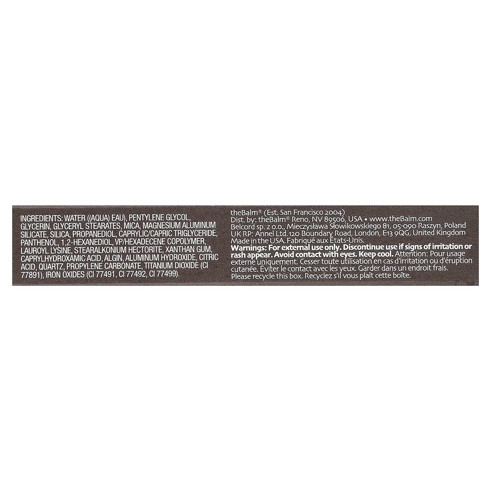 Вода, пентилен гликоль, глицерин, глицерил стеараты, слюда, алюмосиликат магния, диоксид кремния, пропандиол, каприловый/каприновый триглицерид, пантенол, 1,2-гександиол ВП/гексадецен сополимер, лаурил лизин, стеаралкония гекторит, ксантановая камедь, каприлгидроксаминовая кислота, альгин, гидроксид алюминия, лимонная кислота, кварц, пропиленкарбонат, диоксид титана (CI 77891), оксиды железа (CI 77491, CI 77492, CI 77499).