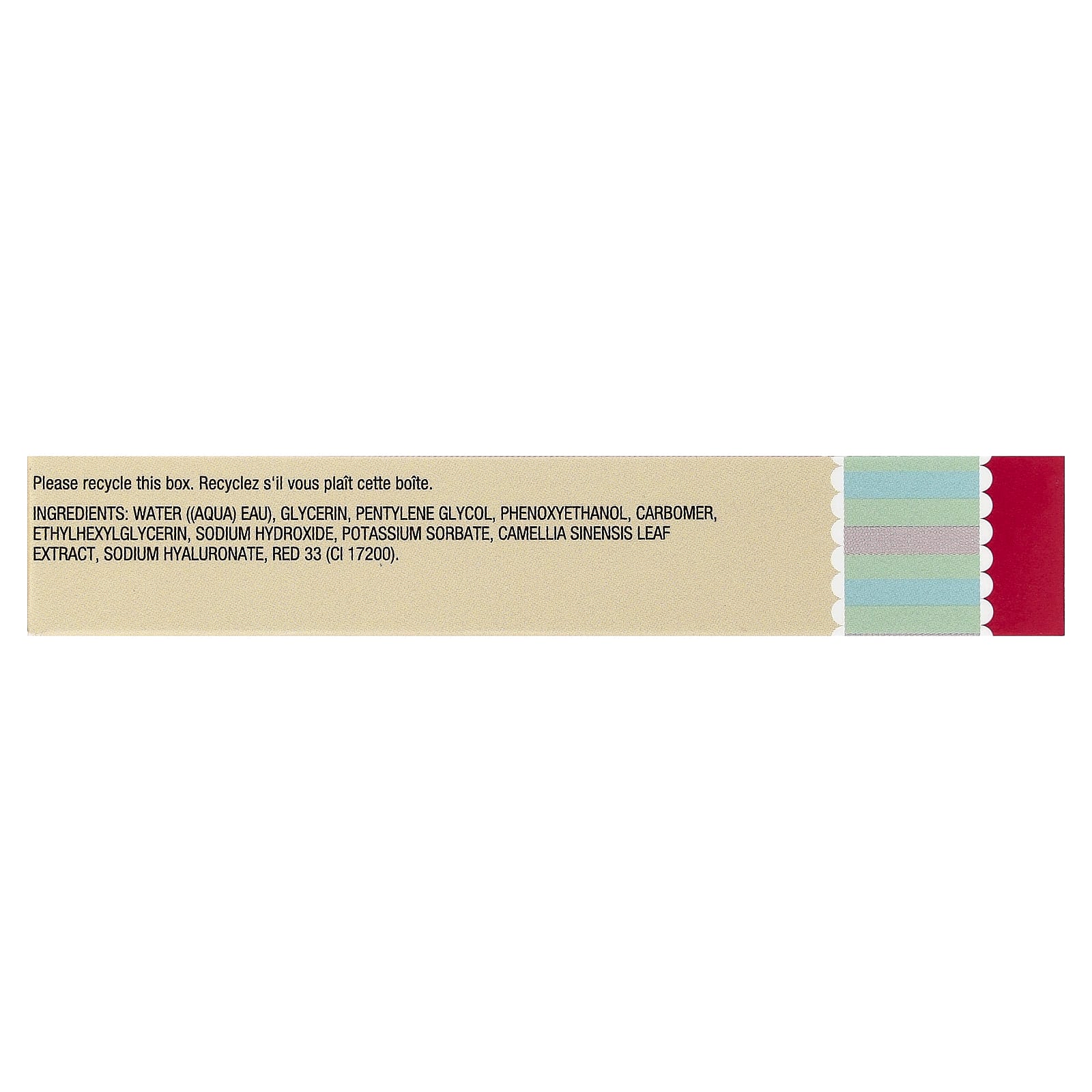 Вода, глицерин, пентилен гликоль, феноксиэтанол, карбомер, этилгексилглицерин, гидроксид натрия, сорбат калия, экстракт листьев зелёного чая (Camellia sinensis), гиалуронат натрия, краситель красный 33 (CI 17200).