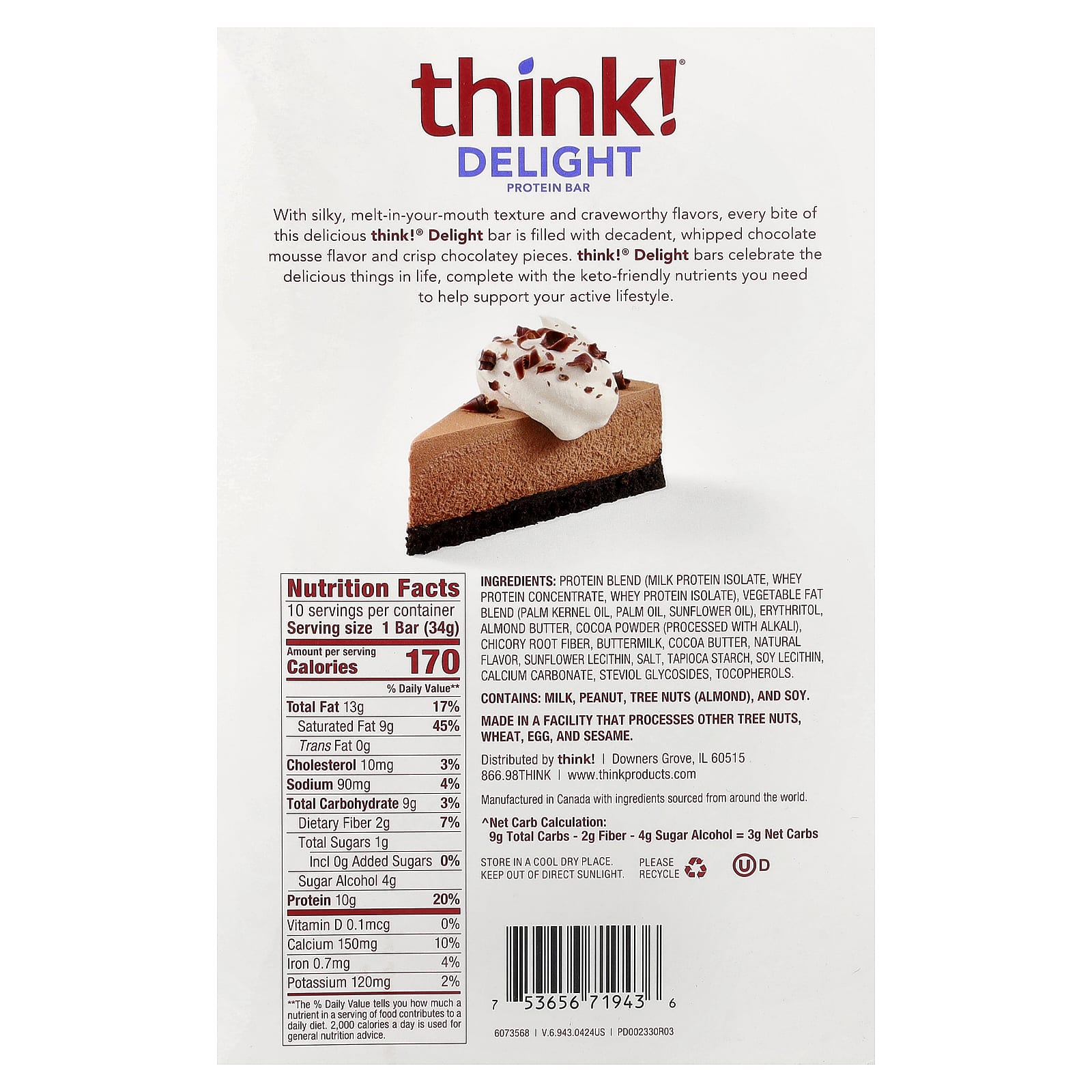 Think !, Delight протеиновый батончик, шоколадный муссовый торт, 10 батончиков по 34 г (1,2 унции)