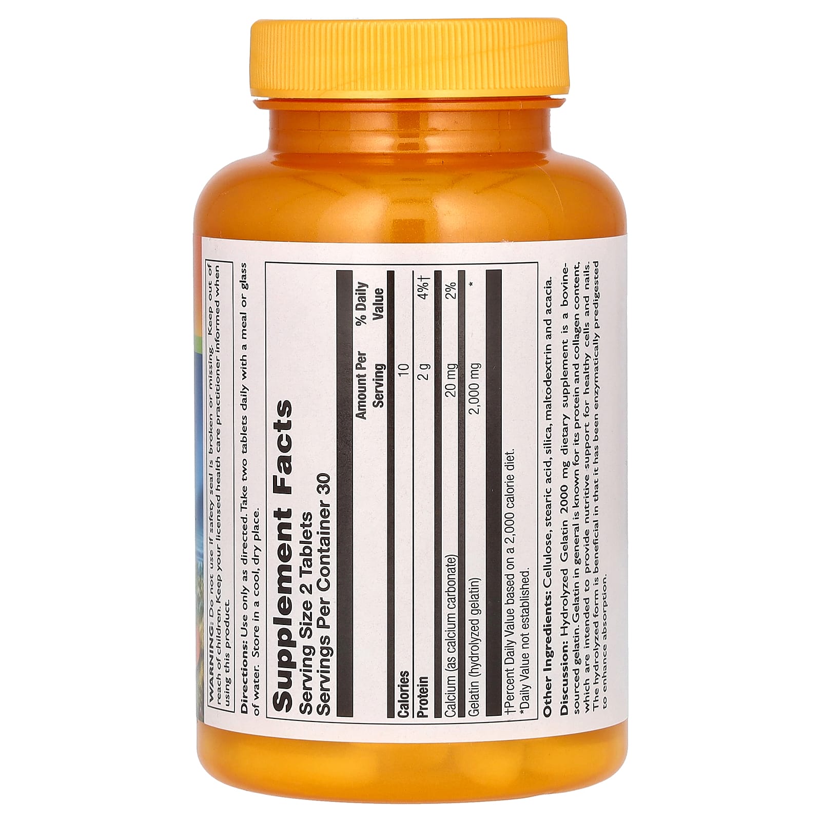 Описание. Пищевая добавка с гидролизованным желатином (2000 мг) представляет собой желатин крупного рогатого скота. Желатин известен своим содержанием белка и коллагена, которые обеспечивают питательную поддержку здоровых клеток и ногтей. Гидролизованная форма полезна тем, что предварительно ферментативно переваривается для улучшения усвоения.