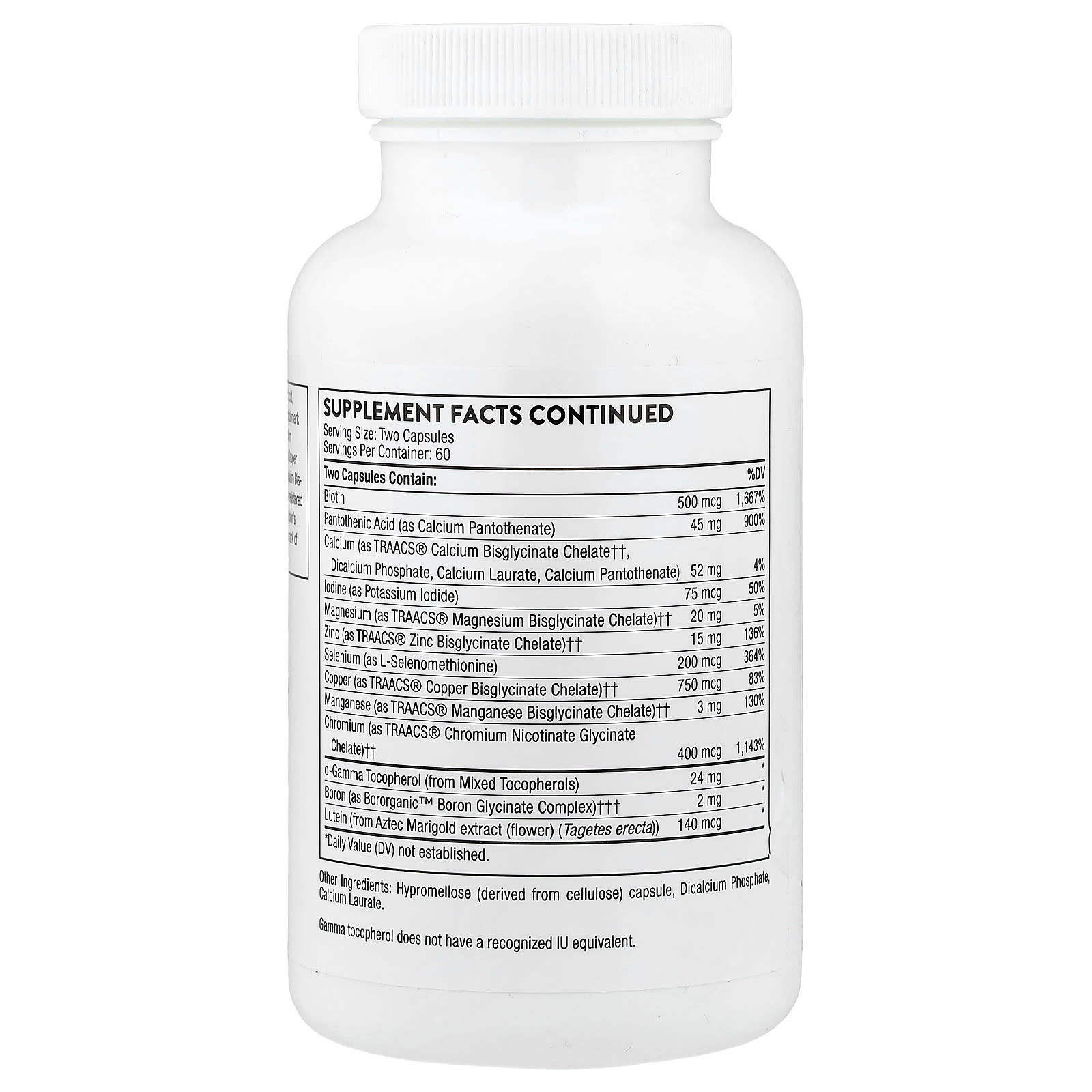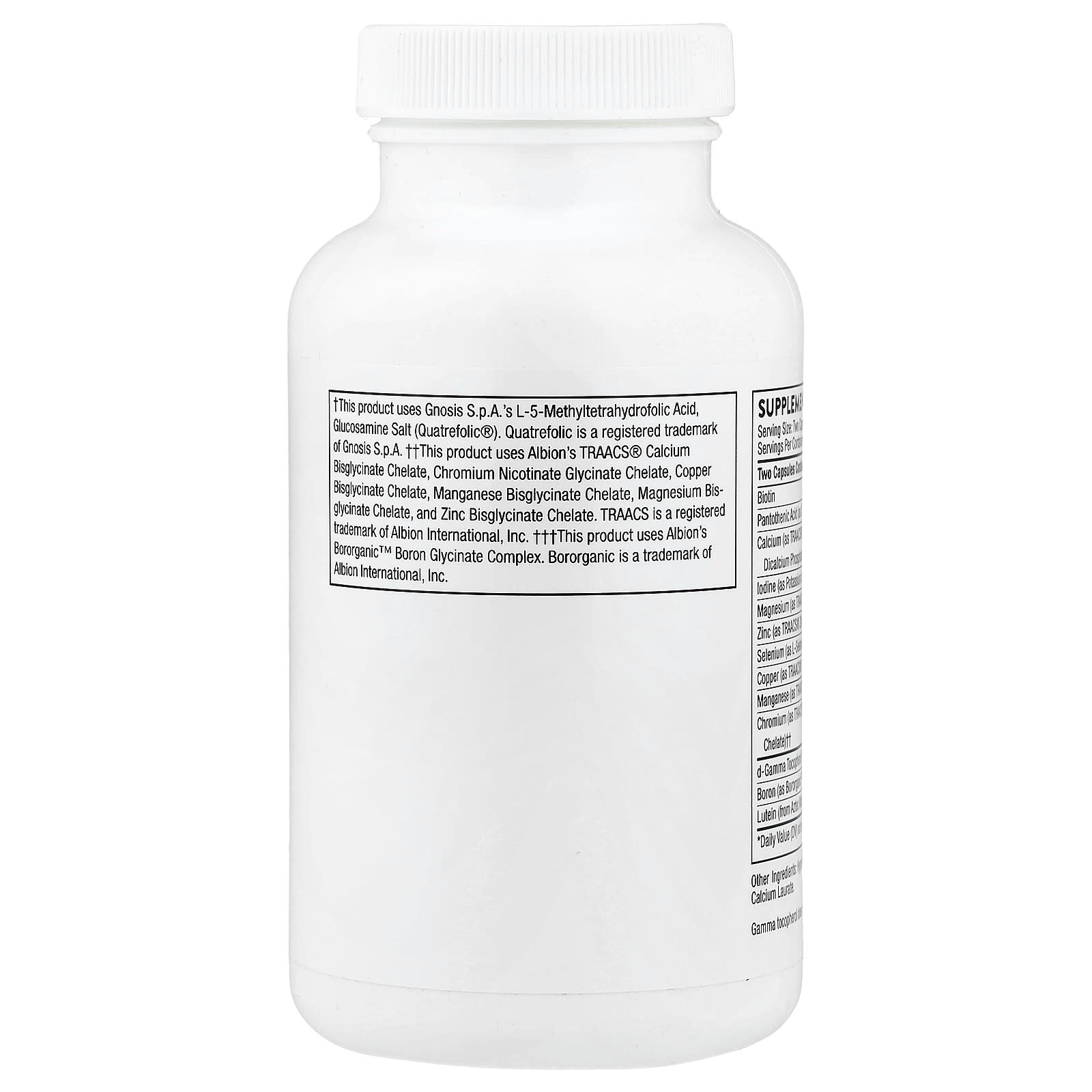 | * Суточная норма не определена. † В этом продукте используется L-5-метилтетрагидрофолиевая кислота, глюкозаминовая соль (Quatrefolic®) производства Gnosis S.p.A. †† В данном продукте используются ингредиенты системы TRAACS® от компании Albion: хелатный бисглицинат кальция, хелатный никотинат глицинат кальция, хелатный бисглицинат меди, хелатный бисглицинат марганца, хелатный бисглицинат магния и хелатный бисглицинат цинка. ††† В данном продукте используется глицинатный комплекс Bororganic Boron™ компании Albion. Гамма-токоферол не имеет признанного эквивалента в МЕ. | ||