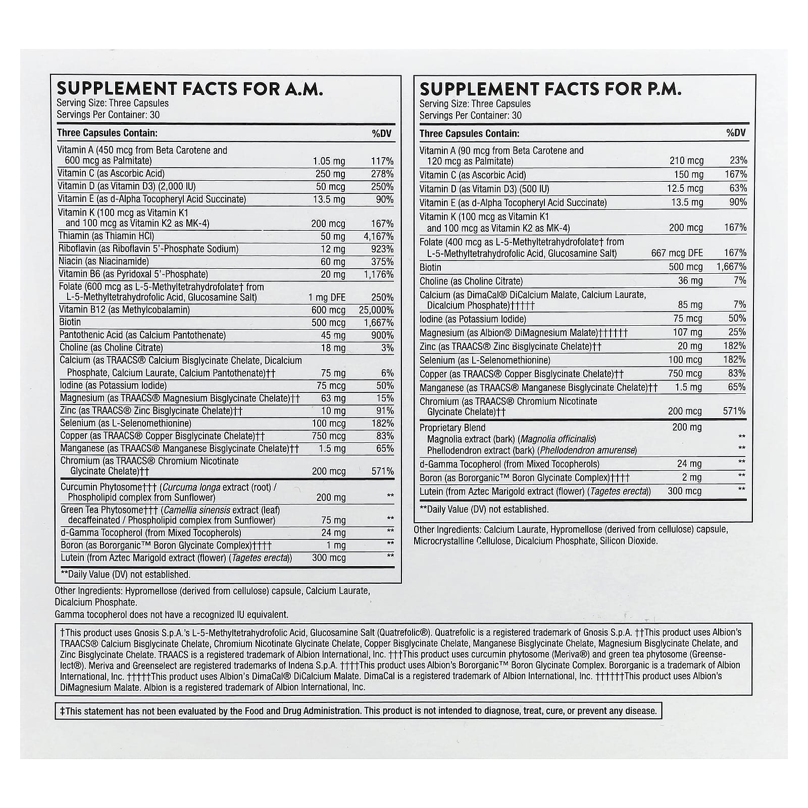 | ** Суточная норма не определена. † В данном продукте используется L-5-метилтетрагидрофолиевая кислота, соль глюкозамина (Quatrefolic®) компании Gnosis SpA. †† В данном продукте используются хелатный бисглицинат кальция TRAACS®, хелатный никотинат глицинат меди, хелатный бисглицинат марганца, хелатный бисглицинат магния и хелатный бисглицинат цинка TRAACS® от Albion. ††† В этом продукте используются фитосомы куркумина (Meriva®) и фитосомы зеленого чая (Greenselect®). †††† В данном продукте используется комплекс глицината бора Bororganic™ компании Albion. ††††† В данном продукте используется дикальций малат DimaCal® компании Albion. | ||