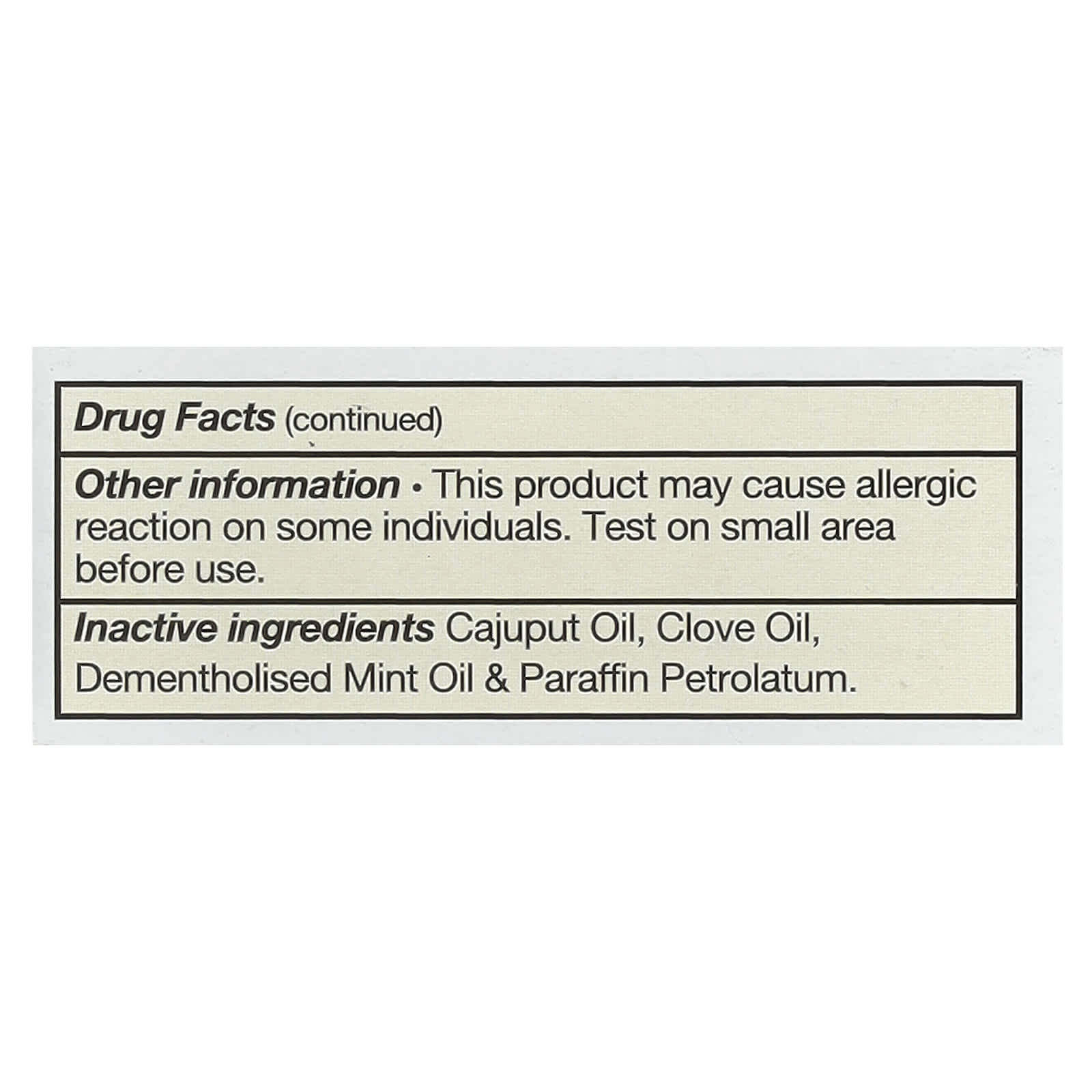 | Вспомогательные ингредиенты: масло каюпутового дерева, гвоздичное масло, дементолизированное мятное масло и парафиновый вазелин. | |