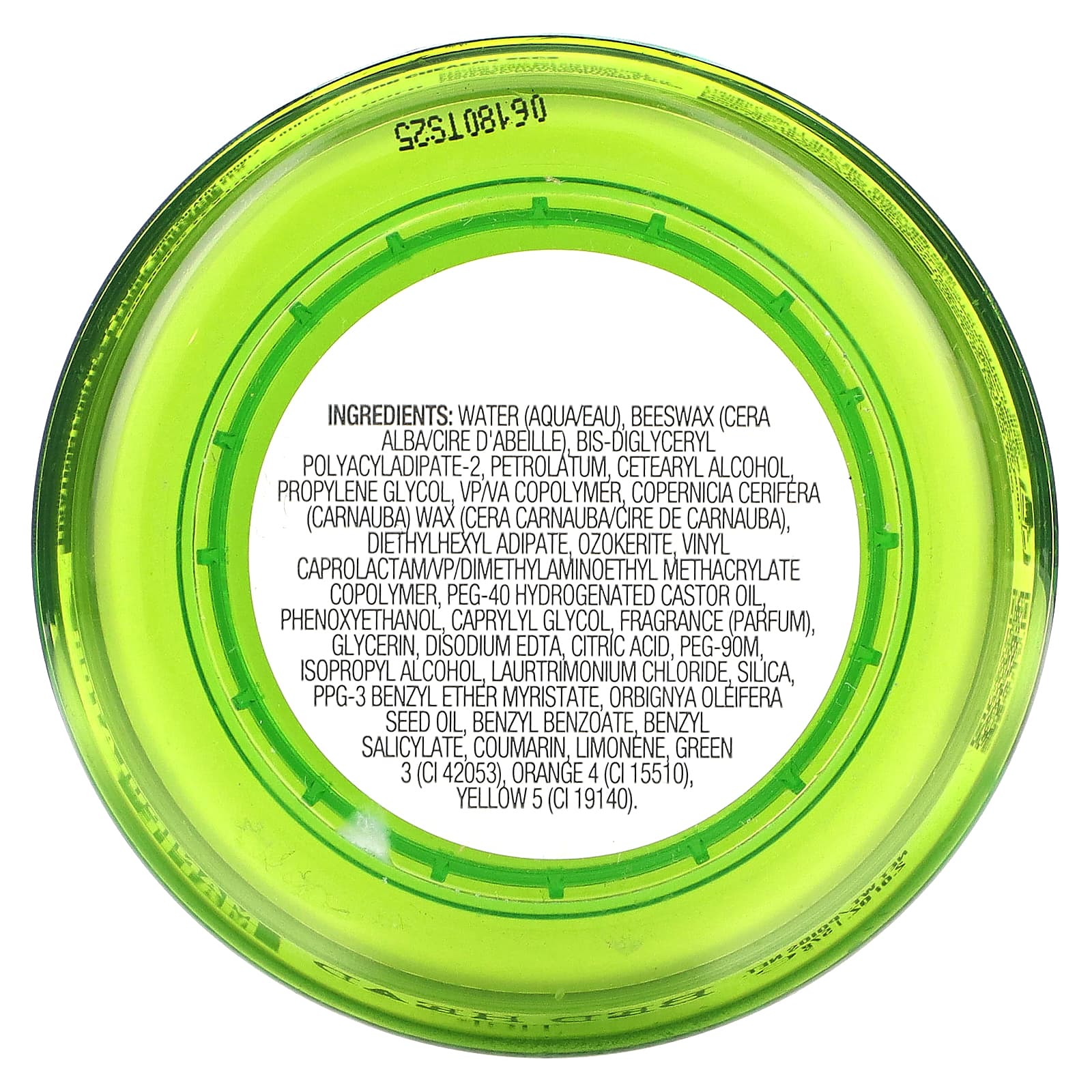 Вода, белый воск (Cera alba), бис-диглицерил полиациладипат-2, вазелин, цетеариловый спирт, пропиленгликоля, ВП/ВА сополимер, воск карнаубский (Copernicia cerifera), диэтилгексил адипат, озокерит, сополимер винилкапролактама / ВП / диметиламиноэтилметакрилата, ПЭГ-40 гидрогенизированное касторовое масло, феноксиэтанол, каприлилгликоль, отдушка (парфюмерная композиция), глицерин, двунатриевая ЭДТК, лимонная кислота, ПЭГ-90м, изопропиловый спирт, лауртримония хлорид, диоксид кремния, ППГ-3 бензилового эфира миристат, масло из семян бабассу (Orbignya oleifera), бензилбензоат, бензилсалицилат, кумарин, лимонена, краситель зеленый 3 (CI 42053), краситель оранжевый 4 (CI 15510), краситель желтый 5 (CI 19140).