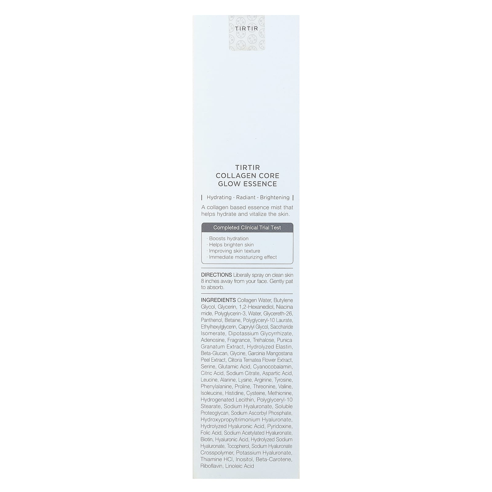 Коллагеновая вода, бутиленгликоль, глицерин, 1,2-гександиол, никотиновая кислота, полиглицерин-3, вода, глицерет-26, пантенол, бетаин, полиглицерил-10 лаурат, этилгексилглицерин, каприлилгликоль, инвертный сахар, дикалия глицирризат, аденозин, отдушка, трегалоза, экстракт граната (Punica granatum), гидролизованный эластин, бета-глюкан, глицин, экстракт кожуры мангустаны, экстракт цветков клитории тройчатой, серин, глутаминовая кислота, цианокобаламин, лимонная кислота, цитрат натрия, аспарагиновая кислота, лейцин, аланин, лизин, аргинин, тирозин, фенилаланин, пролин, треонин, валин, изолейцин, гистидин, цистеин, метионина, гидрогенизированный лецитин, полиглицерил-10 стеарат, гиалуронат натрия, растворимый протеогликан, аскорбил фосфат натрия, гиалуронат гидроксипропилтримония, гидролизованная гиалуроновая кислота, пиридоксин, фолиевая кислота, ацетилированный гиалуронат натрия, биотин, гиалуроновая кислота, гидролизованный гиалуронат натрия, токоферол, кроссполимер гиалуроната натрия, гиалуронат калия, тиамина гидрохлорид, инозитол, бета-каротин, рибофлавин, линолевая кислота.