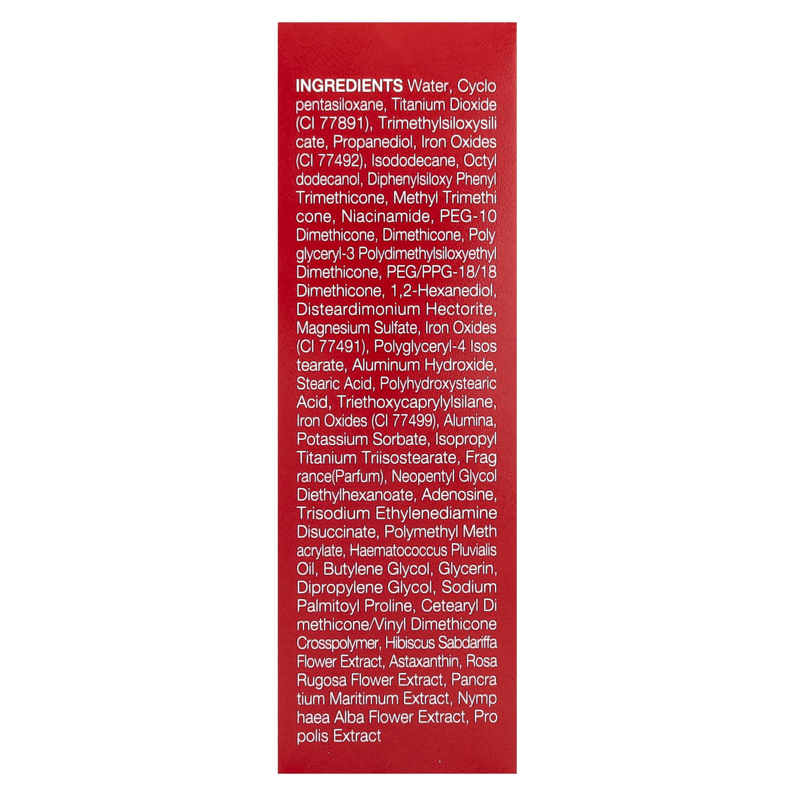 Вода, циклопентасилоксан, диоксид титана (CI 77891), триметилсилоксисиликат, пропандиол, оксиды железа (CI 77492), изододекан, октилдодеканол, дифенил силокси фенилтриметикон, метилтриметикон, никотинамид, ПЭГ-10 диметикон, диметикон, полиглицерил-3-полидиметилсилоксиэтилдиметикон, ПЭГ/ППГ-18/18 диметикон, 1,2-гександиол, дистеардимония гекторит, сульфат магния, оксиды железа (CI 77491), полиглицерил-4 изостеарат, гидроксид алюминия, стеариновая кислота, полигидроксистеариновая кислота, триэтоксикаприлилсилан, оксиды железа (CI 77499), оксид алюминия, сорбат калия, изопропиловый триизостеарат титана, отдушка (парфюмерная композиция), неопентилгликоль диэтилгексаноат, аденозин, тринатрия этилендиамин дисукцинат, полиметилметакрилат, гематококк (гематококк плювиальный), бутиленгликоль, глицерин, дипропиленгликоль, пальмитоил пролин натрия, кроссполимер цетеарилдиметикона / винилдиметикона, экстракт цветков розеллы (Hibiscus sabdariffa), астаксантин, экстракт цветков розы морщинистой, экстракт панкрация морского (Pancratium maritimum), экстракт цветков кувшинки белой (Nymphaea alba), экстракт прополиса.