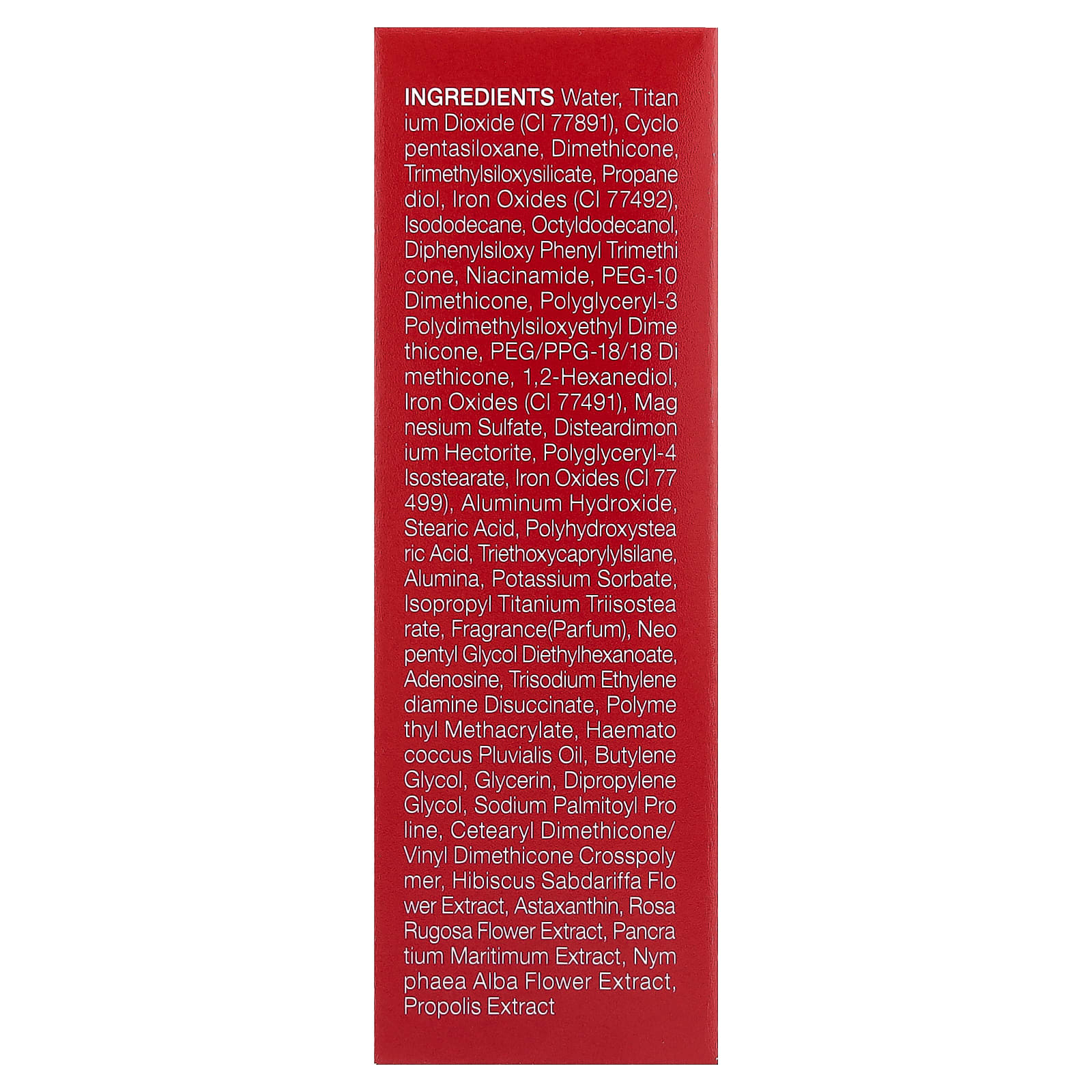 Вода, диоксид титана (CI 77891), циклопентасилоксан, диметикон, триметилсилоксисиликат, пропандиол, оксиды железа (CI 77492) изододекан, октилдодеканол, дифенил силокси фенилтриметикон, никотинамид, ПЭГ-10 диметикон, полиглицерил-3-полидиметилсилоксиэтилдиметикон, ПЭГ / ППГ-18/18 диметикон, 1,2-гександиол, оксиды железа (CI 77491), сульфат магния, дистеардимония гекторит, полиглицерил-4 изостеарат, оксиды железа (CI 77 499), гидроксид алюминия, стеариновая кислота, полигидроксистеариновая кислота, триэтоксикаприлилсилан, оксид алюминия, сорбат калия, изопропиловый триизостеарат титана, отдушка (парфюмерная композиция), неопентилгликоль диэтилгексаноат, аденозин, тринатрий этилендиамин дисукцинат, полиметилметакрилат, масло гемато кокка плювиалис, бутиленгликоль, глицерин, дипропиленгликоль, пальмитоил пролин натрия, кроссполимер цетеарилдиметикона / винилдиметикона, экстракт цветков розеллы (Hibiscus sabdariffa), астаксантин, экстракт цветков розы морщинистой, экстракт панкрация морского (Pancratium maritimum), экстракт цветков кувшинки белой (Nymphaea alba), экстракт прополиса.