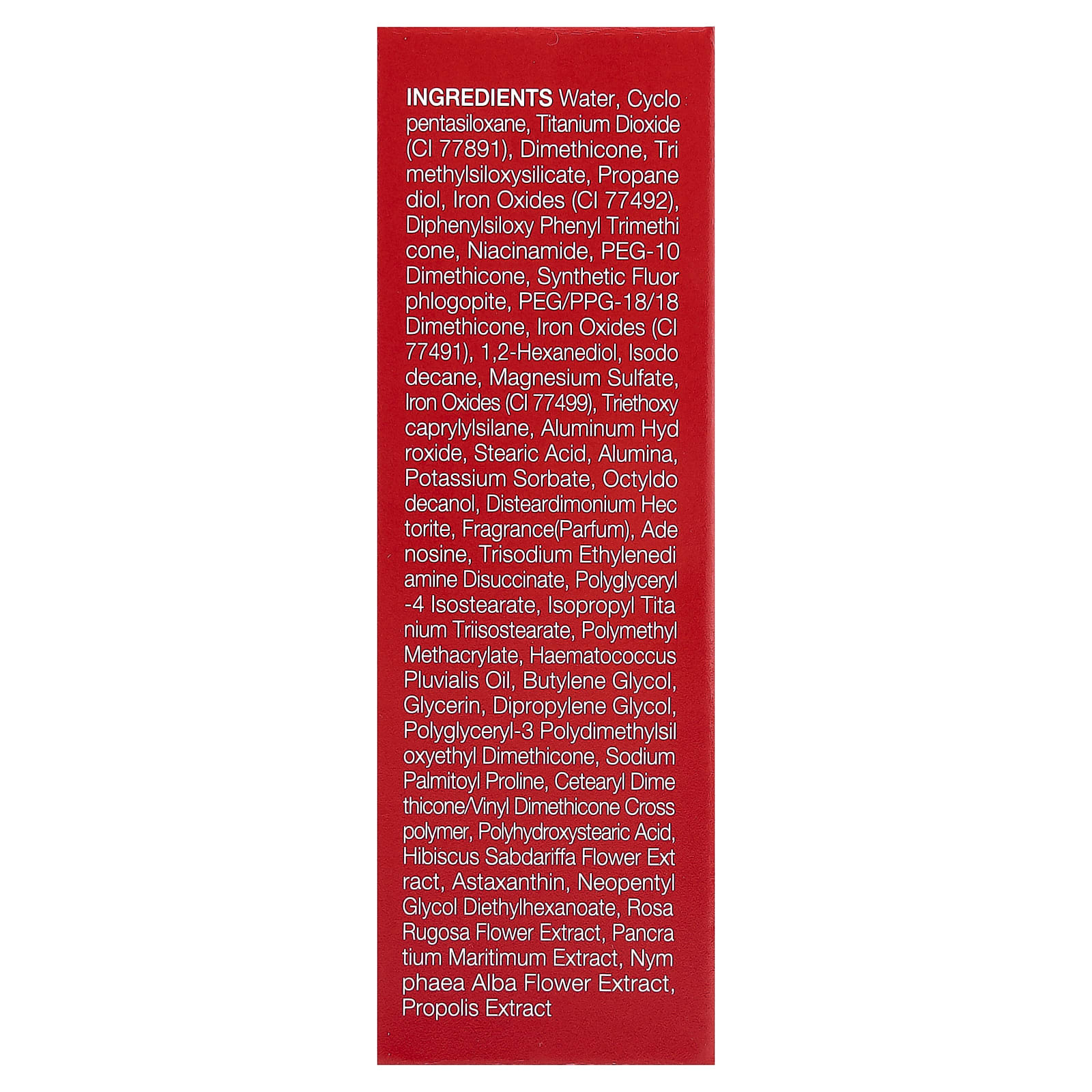 Вода, циклопентасилоксан, диоксид титана (CI 77891), диметикон, триметилсилоксисиликат, пропандиол, оксиды железа (CI 77492), дифенил силокси фенилтриметикон, никотинамид, ПЭГ-10 диметикон, синтетический фторфлогопит, ПЭГ/ППГ-18/18 диметикон, оксиды железа (CI 77491), 1,2-гександиол, изододекан, сульфат магния, оксиды железа (CI 77499), триэтоксикаприлилсилан, гидроксид алюминия, стеариновая кислота, оксид алюминия, сорбат калия, октилдодеканол, дистеардимония гекторит, отдушка (парфюмерная композиция), аденозин, тринатрия этилендиамин дисукцинат, полиглицерил-4 изостеарат, изопропиловый триизостеарат титана, полиметилметакрилат, гематококк (гематококк плювиальный), бутиленгликоль, глицерин, дипропиленгликоль, полиглицерил-3-полидиметилсилоксиэтилдиметикон, пальмитоил пролин натрия, кроссполимер цетеарилдиметикона / винилдиметикона, полигидроксистеариновая кислота, экстракт цветков розеллы (Hibiscus sabdariffa), астаксантин, неопентилгликоль диэтилгексаноат, экстракт цветков розы морщинистой, экстракт панкрация морского (Pancratium maritimum), экстракт цветков кувшинки белой (Nymphaea alba), экстракт прополиса.