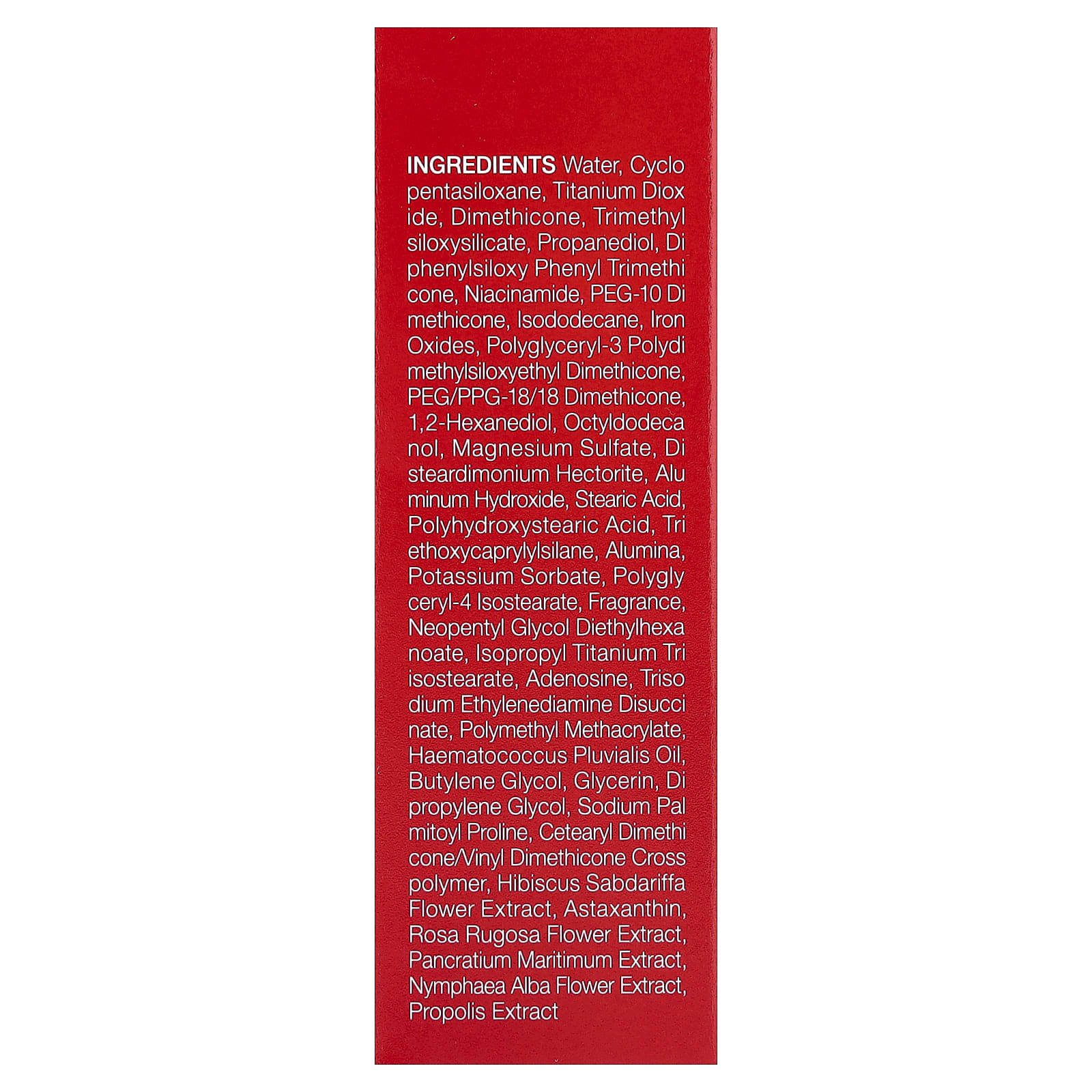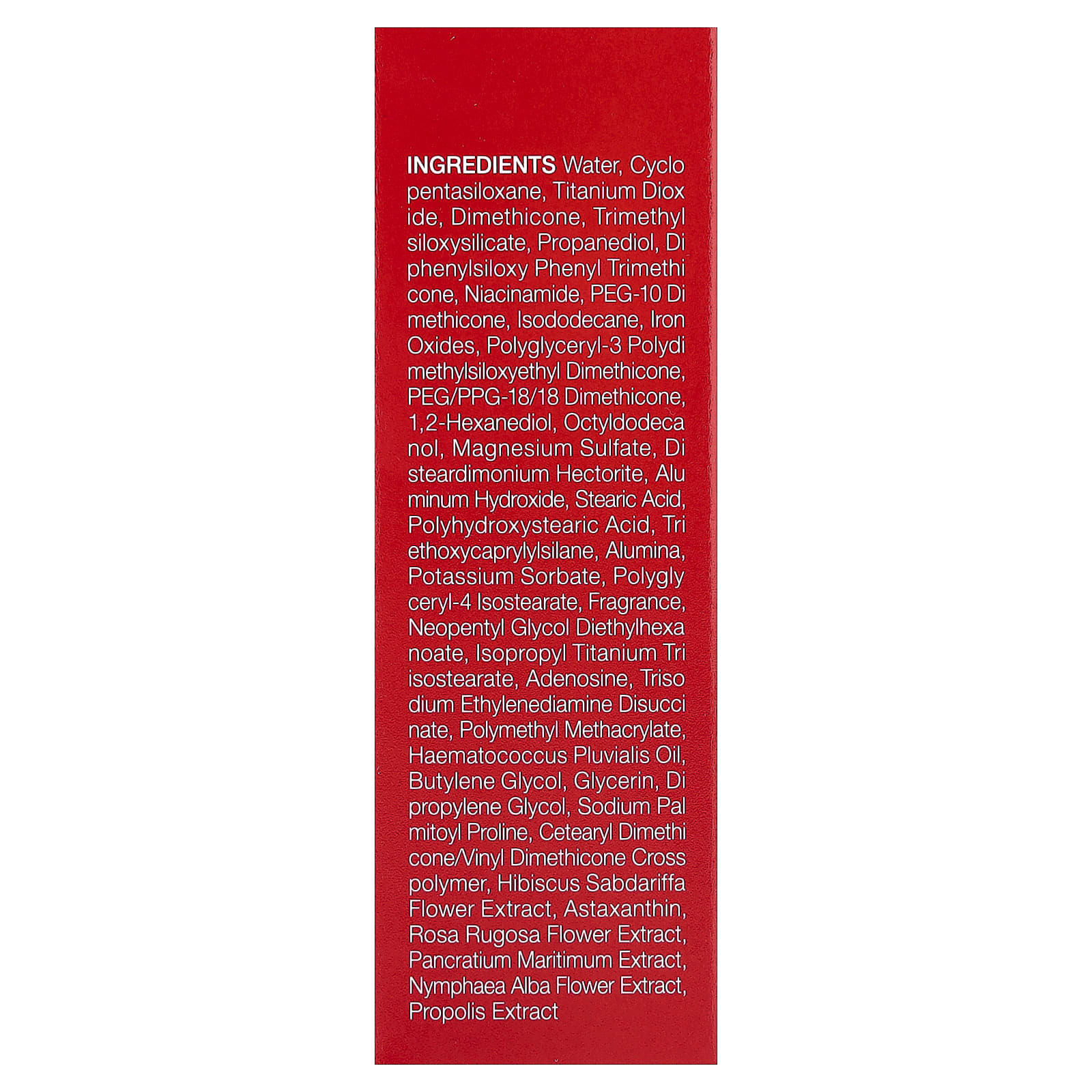 Вода, циклопентасилоксан, диоксид титана, диметикон, триметилсилоксисиликат, пропандиол, дифенил силокси фенилтриметикон, никотинамид, ПЭГ-10 диметикон, изододекан, оксиды железа, полиглицерил-3 полидиметилсилоксиэтил диметикон, ПЭГ/ППГ-18/18 диметикон, 1,2-гександиол, октилдодеканол, сульфат магния, дистеардимония гекторит, гидроксид алюминия, стеариновая кислота, полигидроксистеариновая кислота, триэтоксикаприлилсилан, оксид алюминия, сорбат калия, полиглицерил-4 изостеарат, отдушка, неопентилгликоль диэтилгексаноат, изопропил титана три изостеарат, аденозин, тринатрия этилендиамин дисукцинат, полиметилметакрилат, масло гематококка (Haematococcus pluvialis), бутиленгликоль, глицерин, дипропиленгликоль, пальмитоил пролин натрия, цетеарил диметикон/винил диметикон кроссполимер, экстракт цветков розеллы (Hibiscus sabdariffa), астаксантин, экстракт цветков розы морщинистой, экстракт панкрация морского (Pancratium maritimum), экстракт цветков кувшинки белой (Nymphaea alba), экстракт прополиса.