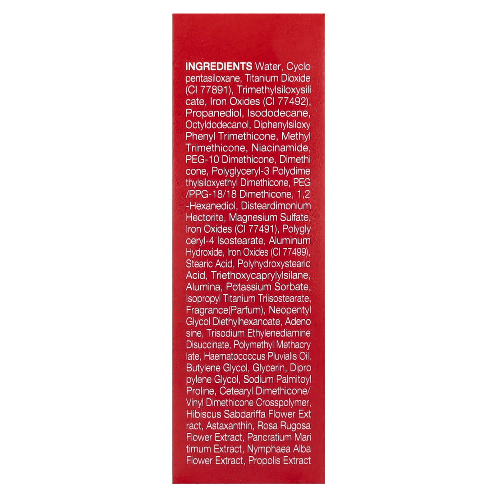 Вода, циклопентасилоксан, диоксид титана (CI 77891), триметилсилоксисиликат, оксиды железа (CI 77492), пропандиол, изододекан, октилдодеканол, дифенил силокси фенилтриметикон, метилтриметикон, никотинамид, ПЭГ-10 диметикон, диметикон, полиглицерил-3-полидиметилсилоксиэтилдиметикон, ПЭГ / ППГ-18/18 диметикон, 1,2-гександиол, дистеардимония гекторит, сульфат магния, оксиды железа (CI 77491), полиглицерил-4 изостеарат, гидроксид алюминия, оксиды железа (CI 77499), стеариновая кислота, полигидроксистеариновая кислота, триэтоксикаприлилсилан, оксид алюминия, сорбат калия, изопропиловый триизостеарат титана, отдушка (парфюмерная композиция), неопентилгликоль диэтилгексаноат, аденозин, тринатрия этилендиамин дисукцинат, полиметилметакрилат, гематококк (гематококк плювиальный), бутиленгликоль, глицерин, дипропиленгликоль, пальмитоил пролин натрия, кроссполимер цетеарилдиметикона / винилдиметикона, экстракт цветков розеллы (Hibiscus sabdariffa), астаксантин, экстракт цветков розы морщинистой, экстракт панкрация морского (Pancratium maritimum), экстракт цветков кувшинки белой (Nymphaea alba), экстракт прополиса.
