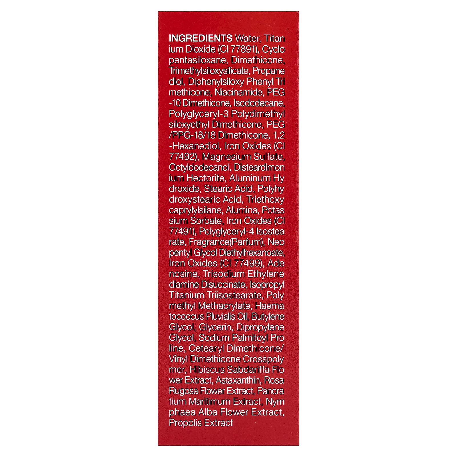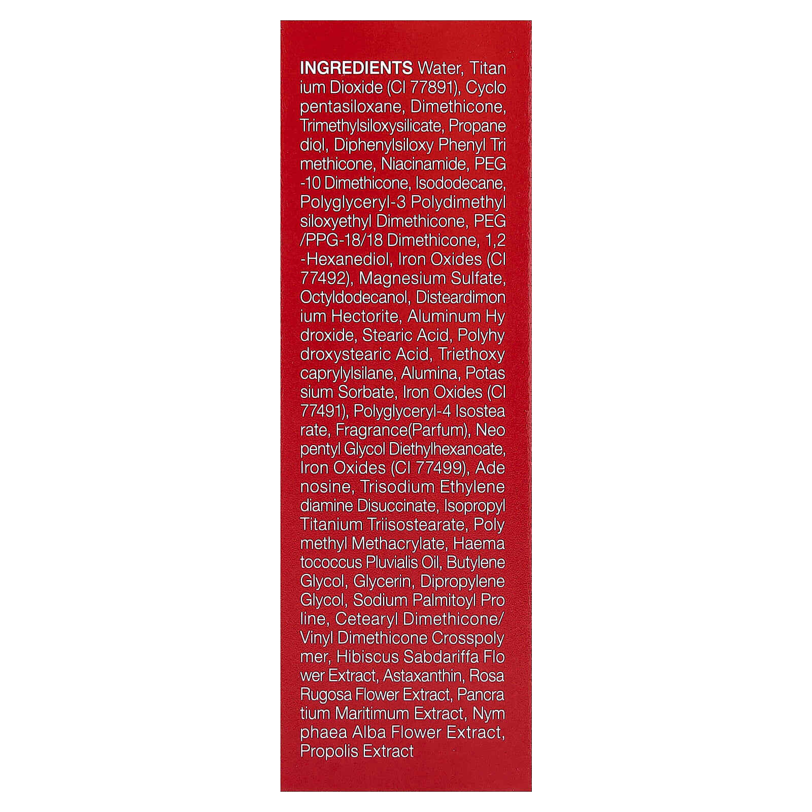Вода, диоксид титана (CI 77891), циклопентасилоксан, диметикон, триметилсилоксисиликат, пропан диол, дифенилсилоксифенилтриметикон, никотинамид, ПЭГ-10 диметикон, изододекан, полиглицерил-3 полидиметилсилоксиэтил диметикон, ПЭГ/ППГ-18/18 диметикон, 1,2-гександиол, оксиды железа (CI 77492), сульфат магния, октилдодеканол, дистеардимония гекторит, гидроксид алюминия, стеариновая кислота, полигидроксистеариновая кислота, триэтоксикаприлилсилан, оксид алюминия, сорбат калия, оксиды железа (CI 77491), полиглицерил-4 изостеарат, отдушка (парфюмерная композиция), неопентилгликоль диэтилгексаноат, оксиды железа (CI 77499), аденозин, тринатрий этилендиамин дисукцинат, изопропиловый триизостеарат титана, полиметилметакрилат, масло гематококка (Haematococcus pluvialis), бутиленгликоль, глицерин, дипропиленгликоль, пальмитоил пролин натрия, кроссполимер цетеарилдиметикона/винилдиметикона, экстракт цветков розеллы (Hibiscus sabdariffa), астаксантин, экстракт цветков розы морщинистой, экстракт панкрация морского (Crithmum maritimum), экстракт цветков кувшинки белой (Nymphaea alba), экстракт прополиса.