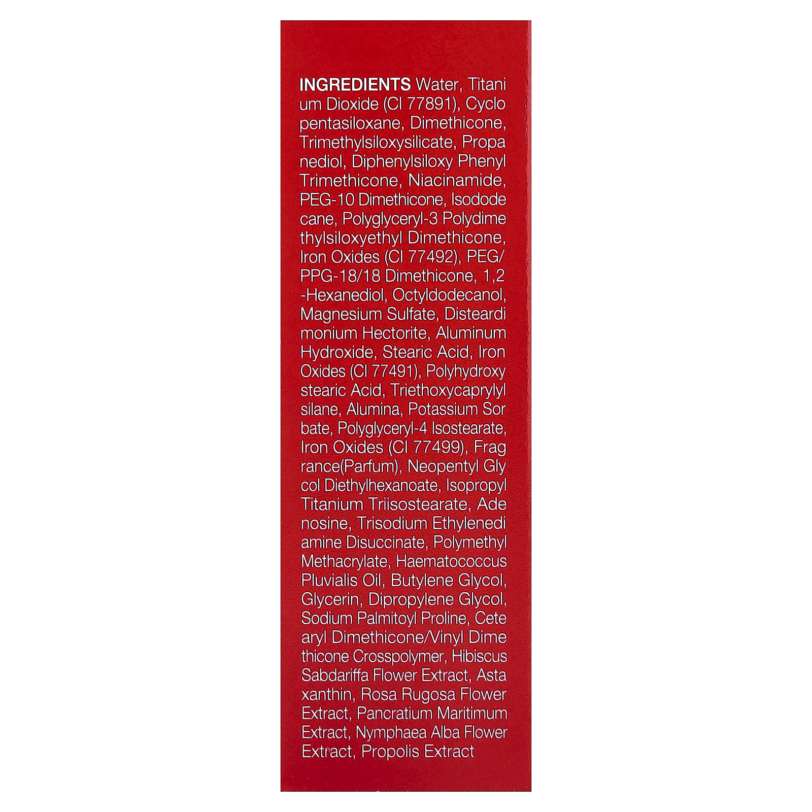 Вода, диоксид титана (CI 77891), циклопентасилоксан, диметикон, триметилсилоксисиликат, пропандиол, дифенил силокси фенилтриметикон, никотинамид, ПЭГ-10 диметикон, изододекан, полиглицерил-3 полидиметилсилоксиэтил диметикон, оксиды железа (CI 77492), ПЭГ/ППГ-18/18 диметикон, 1,2-гександиол, октилдодеканол, сульфат магния, дистеардимония гекторит, гидроксид алюминия, стеариновая кислота, оксиды железа (CI 77491), полигидрокси стеариновая кислота, триэтоксикаприлилсилан, оксид алюминия, сорбат калия, полиглицерил-4 изостеарат, оксиды железа (CI 77499), отдушка (парфюмерная композиция), неопентилгликоль диэтилгексаноат, изопропиловый триизостеарат титана, аденозин, тринатрия этилендиамин дисукцинат, полиметилметакрилат, масло гематококка (Haematococcus pluvialis), бутиленгликоль, глицерин, дипропиленгликоль, пальмитоил пролин натрия, цетеарил диметикон/винил диметикон кроссполимер, экстракт цветков розеллы (Hibiscus sabdariffa), астаксантин, экстракт цветков розы морщинистой, экстракт панкрация морского (Pancratium maritimum), экстракт цветков кувшинки белой (Nymphaea alba), экстракт прополиса.