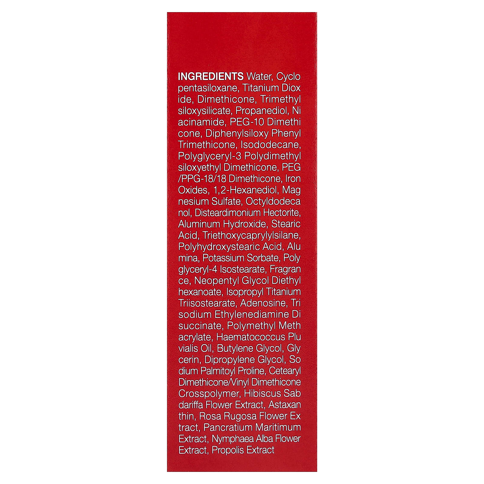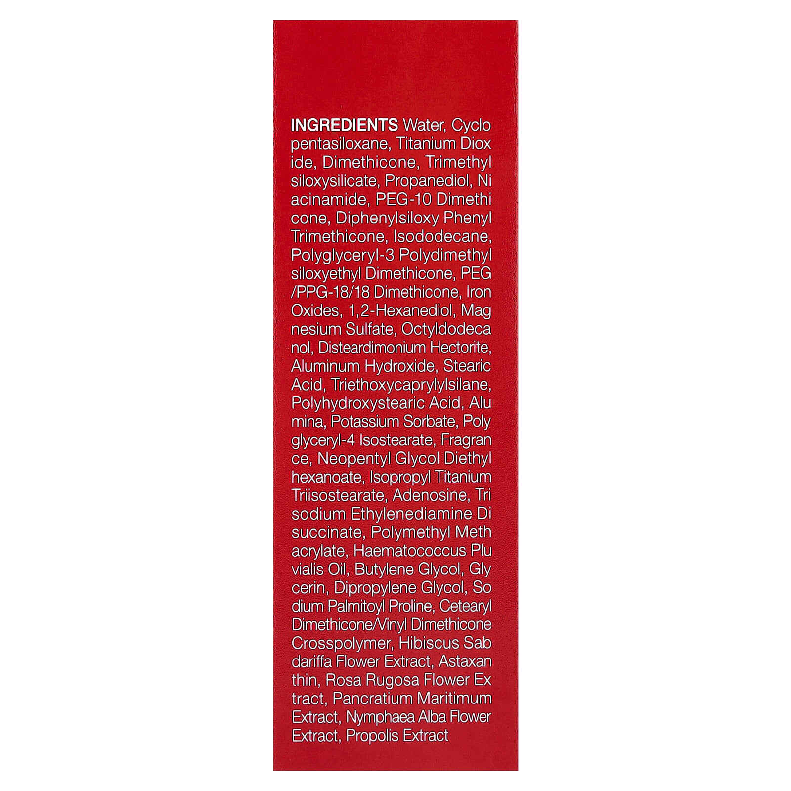 Вода, циклопентасилоксан, диоксид титана, диметикон, триметилсилоксисиликат, пропандиол, никотинамид, ПЭГ-10 диметикон, дифенил силокси фенилтриметикон, изододекан, полиглицерил-3 полидиметилсилоксиэтил диметикон, ПЭГ/ППГ-18/18 диметикон, оксиды железа, 1,2-гександиол, сульфат магния, октилдодеканол, дистеардимония гекторит, гидроксид алюминия, стеариновая кислота, триэтоксикаприлилсилан, полигидроксистеариновая кислота, оксид алюминия, сорбат калия, полиглицерил-4 изостеарат, отдушка, неопентилгликоль диэтил гексаноат, изопропиловый триизостеарат титана, аденозин, тринатрия этилендиамин дисукцинат, полиметилметакрилат, масло гематококка (Haematococcus pluvialis), бутиленгликоль, глицерин, дипропиленгликоль, пальмитоил пролин натрия, цетеарил диметикон/винил диметикон кроссполимер, экстракт цветков розеллы (Hibiscus sabdariffa), астаксантин, экстракт цветков розы морщинистой, экстракт панкрация морского (Pancratium maritimum), экстракт цветков кувшинки белой (Nymphaea alba), экстракт прополиса.