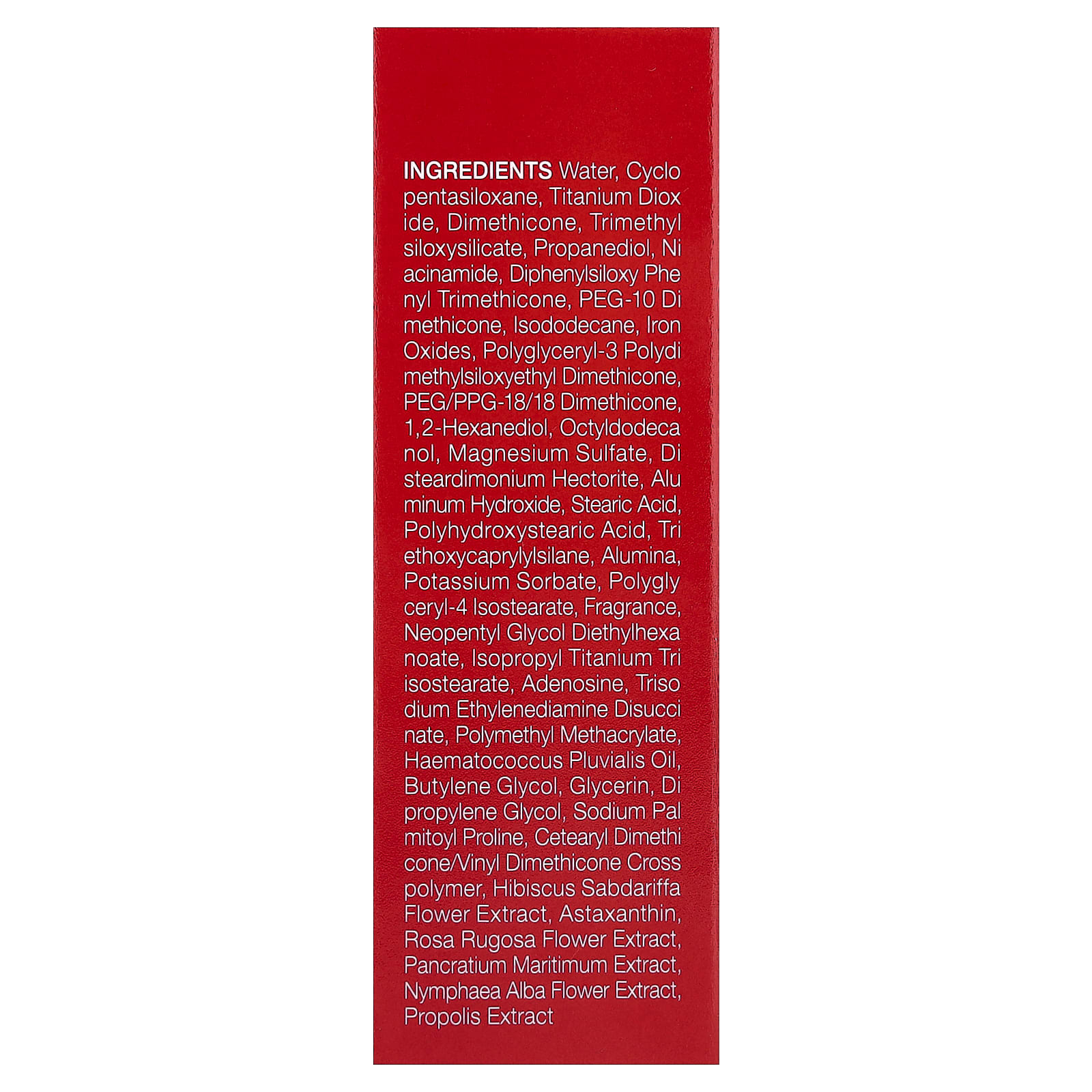 Вода, циклопентасилоксан, диоксид титана, диметикон, триметилсилоксисиликат, пропандиол, никотинамид, дифенил силокси фенилтриметикон, ПЭГ-10 диметикон, изододекан, оксиды железа, полиглицерил-3 полидиметилсилоксиэтил диметикон, ПЭГ/ППГ-18/18 диметикон, 1,2-гександиол, октилдодеканол, сульфат магния, дистеардимония гекторит, гидроксид алюминия, стеариновая кислота, полигидроксистеариновая кислота, триэтоксикаприлилсилан, оксид алюминия, сорбат калия, полиглицерил-4 изостеарат, отдушка, неопентилгликоль диэтилгексаноат, изопропил титана три изостеарат, аденозин, тринатрия этилендиамин дисукцинат, полиметилметакрилат, масло гематококка (Haematococcus pluvialis), бутиленгликоль, глицерин, дипропиленгликоль, пальмитоил пролин натрия, цетеарил диметикон/винил диметикон кроссполимер, экстракт цветков розеллы (Hibiscus sabdariffa), астаксантин, экстракт цветков розы морщинистой, экстракт панкрация морского (Pancratium maritimum), экстракт цветков кувшинки белой (Nymphaea alba), экстракт прополиса.