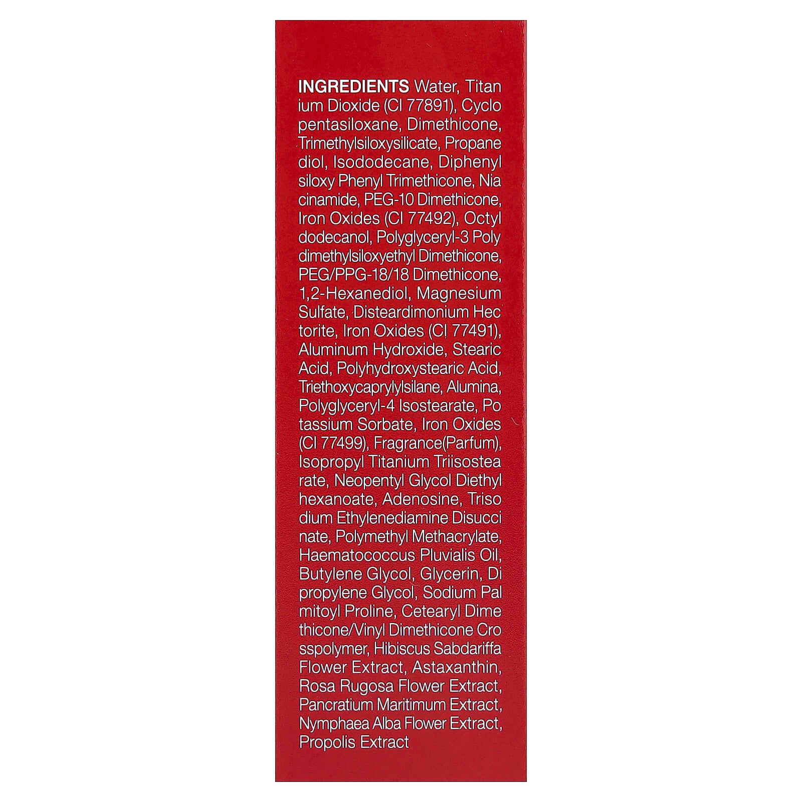Вода, диоксид титана (CI 77891), циклопентасилоксан, диметикон, триметилсилоксисиликат, пропандиол, изододекан, дифенил силокси фенилтриметикон, никотинамид, ПЭГ-10 диметикон, оксиды железа (CI 77492), октил додеканол, полиглицерил-3 поли диметилсилоксиэтил диметикон, ПЭГ/ППГ-18/18 диметикон, 1,2-гександиол, сульфат магния, дистеардимония гекторит, оксиды железа (CI 77491), гидроксид алюминия, стеариновая кислота, полигидроксистеариновая кислота, триэтоксикаприлилсилан, оксид алюминия, полиглицерил-4 изостеарат, сорбат калия, оксиды железа (CI 77499), отдушка (парфюмерная композиция), изопропиловый триизостеарат титана, неопентилгликоль диэтилгексаноат, аденозин, тринатрия этилендиамин дисукцинат, полиметилметакрилат, масло гематококка (Haematococcus pluvialis), бутиленгликоль, глицерин, дипропиленгликоль, пальмитоил пролин натрия, цетеарил диметикон/винил диметикон кроссполимер, экстракт цветков розеллы (Hibiscus sabdariffa), астаксантин, экстракт цветков розы морщинистой, экстракт панкрация морского (Pancratium maritimum), экстракт цветков кувшинки белой (Nymphaea alba), экстракт прополиса.