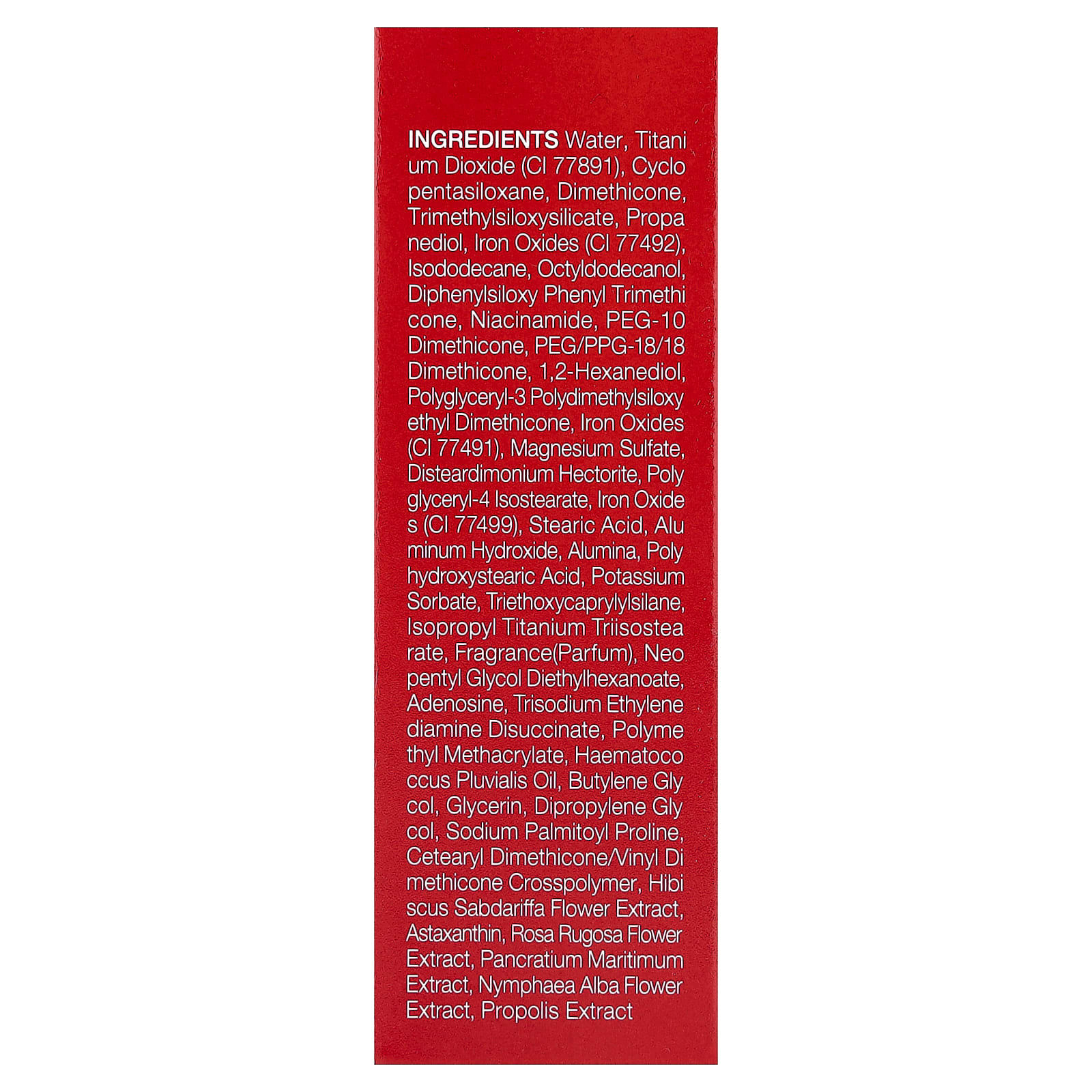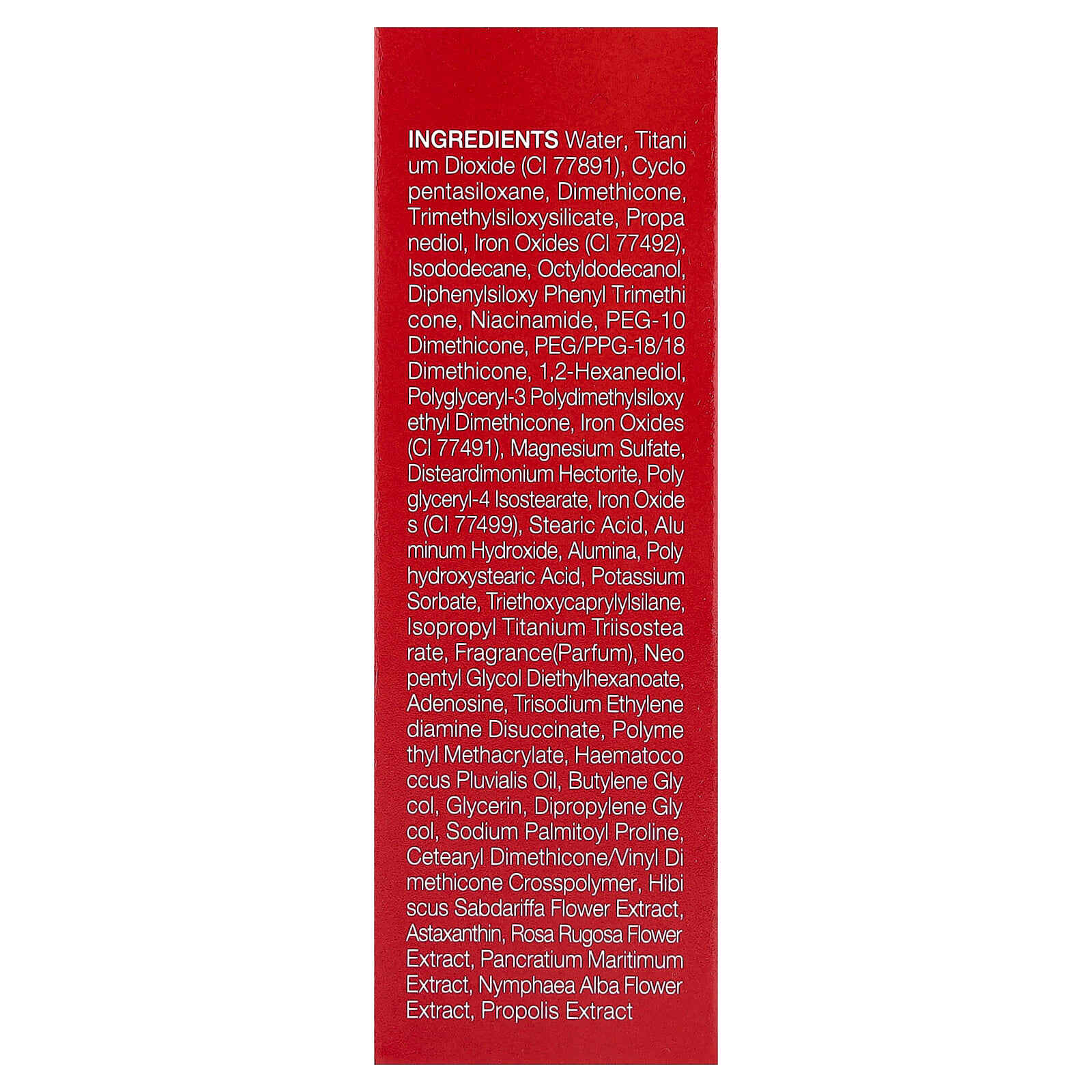 Вода, диоксид титана (CI 77891), циклопентасилоксан, диметикон, триметилсилоксисиликат, пропандиол, оксиды железа (CI 77492), изододекан, октилдодеканол, дифенил силокси фенилтриметикон, никотинамид, ПЭГ-10 диметикон, ПЭГ/ППГ-18/18 диметикон, 1,2-гександиол, полиглицерил-3 полидиметилсилоксиэтил диметикон, оксиды железа (CI 77491), сульфат магния, дистеардимония гекторит, полиглицерил-4 изостеарат, оксиды железа (CI 77499), стеариновая кислота, гидроксид алюминия, оксид алюминия, полигидроксистеариновая кислота, сорбат калия, триэтоксикаприлилсилан, изопропиловый триизостеарат титана, отдушка (парфюмерная композиция), неопентилгликоль диэтилгексаноат, аденозин, тринатрия этилендиамин дисукцинат, полиметилметакрилат, масло гематококка (Haematococcus pluvialis), бутиленгликоль, глицерин, дипропиленгликоль, пальмитоил пролин натрия, цетеарил диметикон/винил диметикон кроссполимер, экстракт цветков розеллы (Hibiscus sabdariffa), астаксантин, экстракт цветков розы морщинистой, экстракт панкрация морского (Pancratium maritimum), экстракт цветков кувшинки белой (Nymphaea alba), экстракт прополиса.