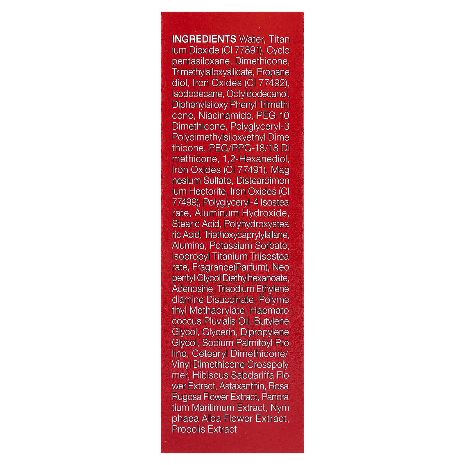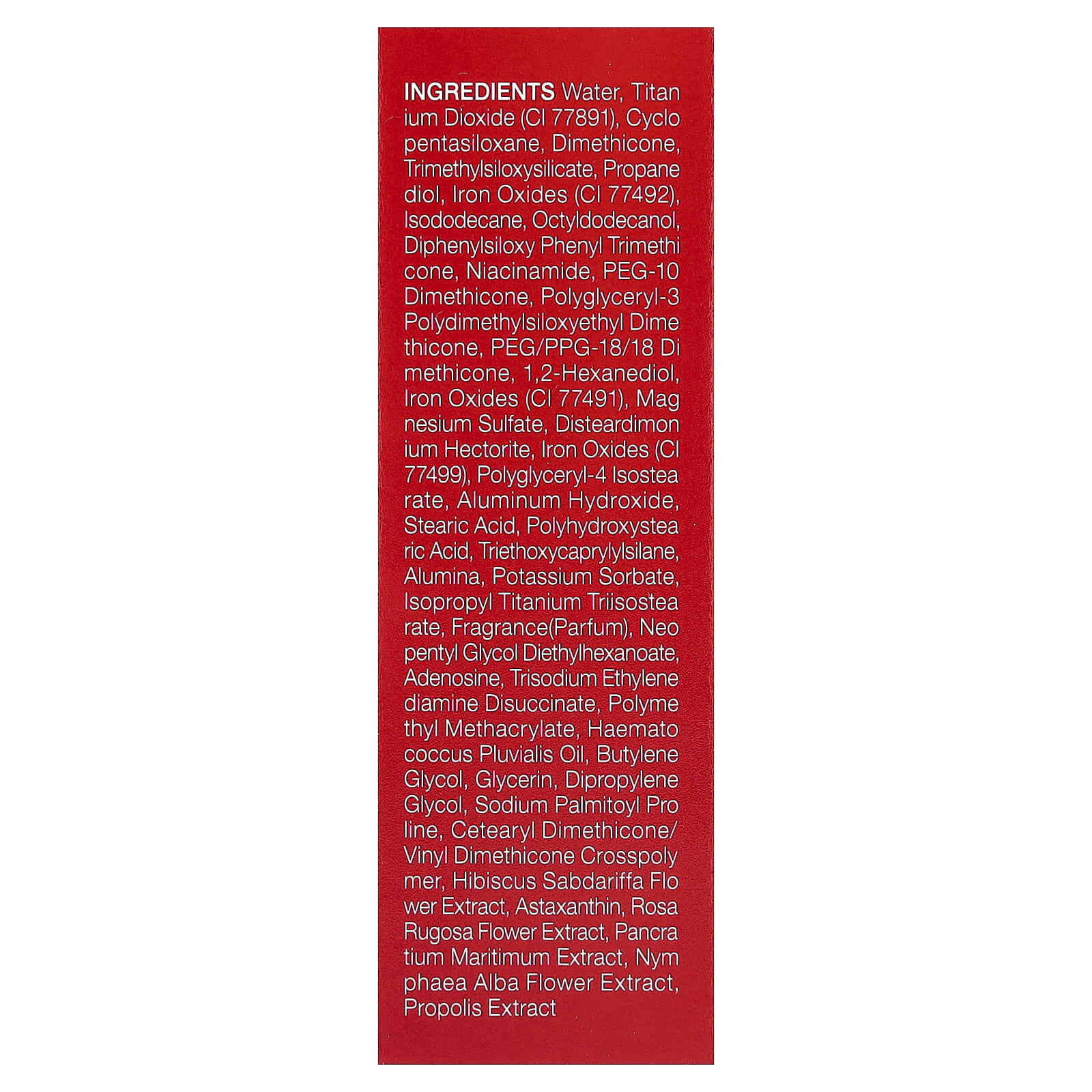 Вода, диоксид титана (CI 77891), циклопентасилоксан, диметикон, триметилсилоксисиликат, пропандиол, оксиды железа (CI 77492), изододекан, октилдодеканол, дифенил силокси фенилтриметикон, никотинамид, ПЭГ-10 диметикон, полиглицерил-3 полидиметилсилоксиэтил диметикон, ПЭГ/ППГ-18/18 диметикон, 1,2-гександиол, оксиды железа (CI 77491), сульфат магния, дистеардимония гекторит, оксиды железа (CI 77499), полиглицерил-4 изостеарат, гидроксид алюминия, стеариновая кислота, полигидроксистеариновая кислота, триэтоксикаприлилсилан, оксид алюминия, сорбат калия, изопропиловый триизостеарат титана, отдушка (парфюмерная композиция), неопентилгликоль диэтилгексаноат, аденозин, тринатрий этилендиамин дисукцинат, полиметилметакрилат, масло гематококка дождевого (Haemato coccus pluvialis), бутиленгликоль, глицерин, дипропиленгликоль, пальмитоил пролин натрия, кроссполимер цетеарилдиметикона/винилдиметикона, экстракт цветков розеллы (Hibiscus sabdariffa), астаксантин, экстракт цветков розы морщинистой, экстракт панкрация морского (Pancratium maritimum), экстракт цветков кувшинки белой (Nymphaea alba), экстракт прополиса.