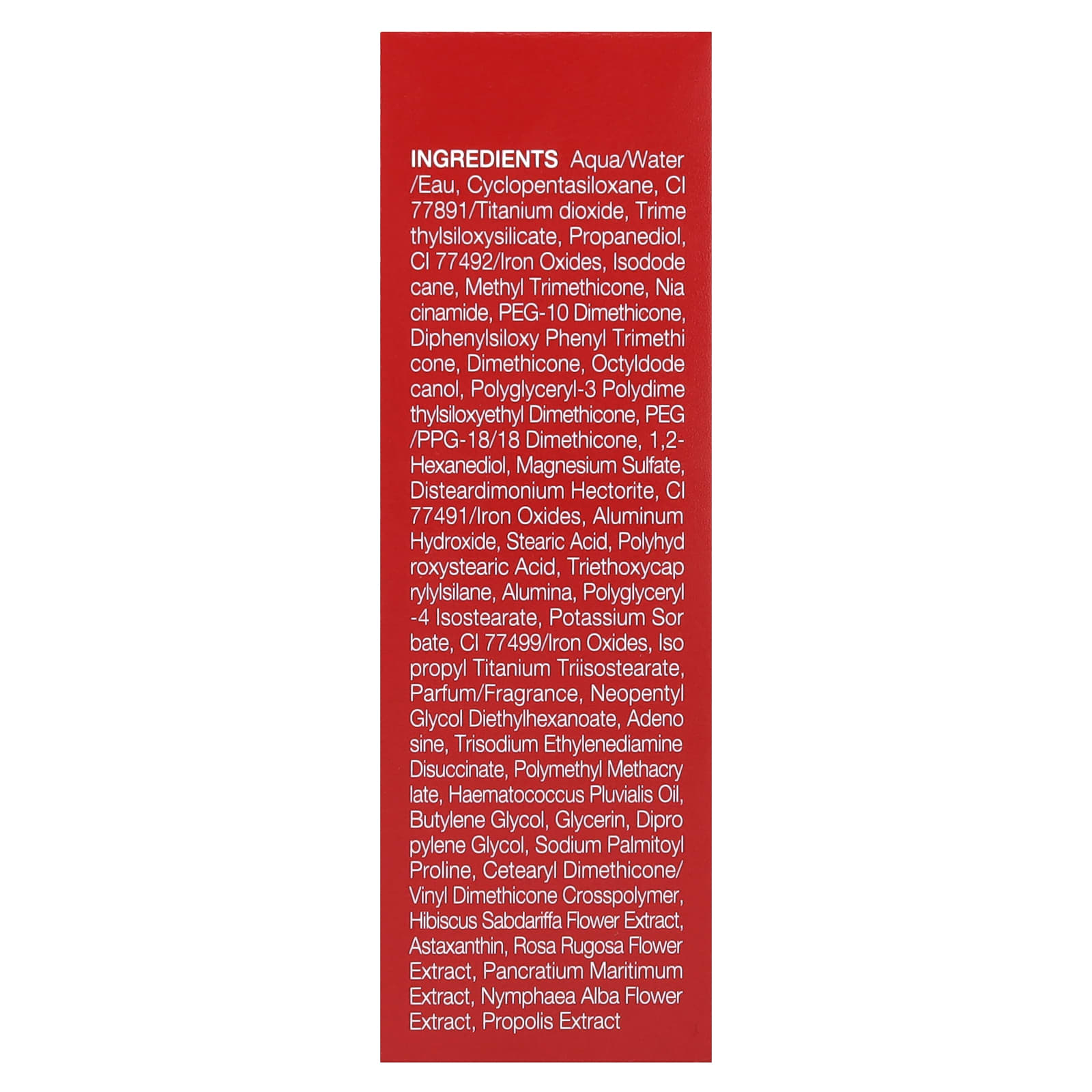 Вода (Aqua/eau), циклопентасилоксан, диоксид титана (CI 77891), триметилсилоксисиликат, пропандиол, оксид железа (CI 77492), изододекан, метил триметикон, никотинамид, ПЭГ-10 диметикон, дифенил силокси фенилтриметикон, диметикон, октилдодеканол, полиглицерил-3 полидиметилсилоксиэтил диметикон, ПЭГ/ППГ-18/18 диметикон, 1,2-гександиол, сульфат магния, дистеардимония гекторит, оксид железа (CI 77491), гидроксид алюминия, стеариновая кислота, полигидроксистеариновая кислота, триэтоксикаприлилсилан, оксид алюминия, полиглицерил-4 изостеарат, сорбат калия, оксид железа (CI 77499), изопропиловый триизостеарат титана, парфюмерная композиция (отдушка), неопентилгликоль диэтилгексаноат, аденозин, тринатрия этилендиамин дисукцинат, полиметилметакрилат, масло гематококка (Haematococcus pluvialis), бутиленгликоль, глицерин, дипропиленгликоль, пальмитоил пролин натрия, кроссполимер цетеарилдиметикона/винилдиметикона, экстракт цветков розеллы (Hibiscus sabdariffa), астаксантин, экстракт цветков розы морщинистой, экстракт панкрация морского (Pancratium maritimum), экстракт цветков кувшинки белой (Nymphaea alba), экстракт прополиса.