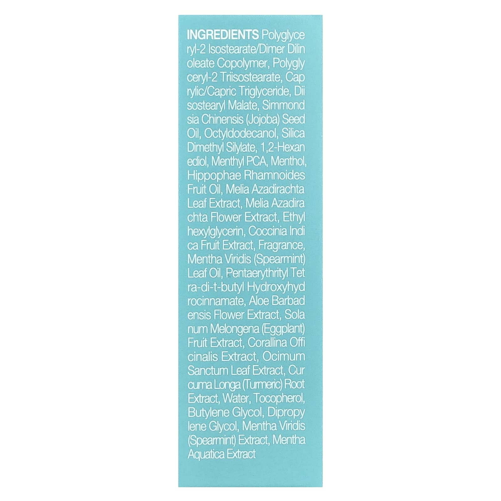 Сополимер полиглицерил-2 изостеарат / димер дилинолеат, полиглицерил-2 триизостеарат, каприловый/каприновый триглицерид, диизостеарил малат, масло из семян жожоба (Simmondsia chinensis), октилдодеканол, диметил силилат диоксида кремния, 1,2-гександиол, ментил ПКК, ментол, масло из плодов облепихи крушиновидной (Hippophae rhamnoides), экстракт листьев дерева ним (Melia azadirachta), экстракт цветков дерева ним (Melia azadirachta), этил гексилглицерин, экстракт плодов кокцинии индийской (Coccina indica), отдушка, масло листьев мяты колосистой (Mentha viridis), пентаэритритил тетра-ди-трет-бутил гидроксигидроциннамат, экстракт цветков алоэ вера (Aloe barbadensis), экстракт плодов баклажана (Solanum melongena), экстракт кораллины лекарственной (Corallina officinalis), экстракт листьев туласи (Ocimum sanctum), экстракт корня куркумы (Curcuma longa), вода, токоферол, бутиленгликоль, дипропиленгликоль, экстракт мяты колосистой (Mentha viridis), экстракт мяты водной.