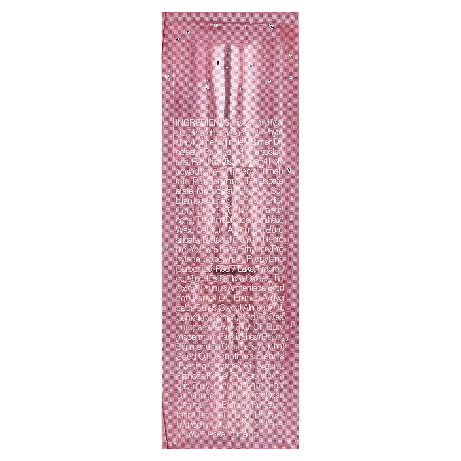 дистеарил малат, бис-бегенил/изостеарил/фитостерил димер дилинолеи димер дилинолеат, полиглицерил-2 тиизостеарат, парафина, бис-диглицерил полиациладипат-2, тридецил тримеллитат, пентаэритритил тетраизостеарат, микрокристаллический воск, сорбитан изостеарат, 1,2-гександиол цетил ПЭГ/ППГ 10/1 диметикон, диоксид титана, синтетический воск, кальций алюминий боросиликат, дистеардимония гекторит, краситель желтый 6 лак, сополимер этилена/пропилена, пропиленкарбонат, краситель красный 7 лак, отдушка, лак синий-1, оксиды железа, оксид олова, масло из косточек абрикоса (Prunus armeniaca), масло сладкого миндаля (Prunus amygdalus dulis), масло из семян камелии японской (Camellia japonica), оливковое масло (Olea europaea), масло ши (Butyrospermum parkii), масло семян жожоба (Simmondsia chinensis), масло примулы вечерней (Oenothera biennis), аргановое масло (Argania spinosa), каприловый/каприновый триглицерид, экстракт плодов манго (Mangifera indica), экстракт плодов шиповника (Rosa canina), пентаэритритил тетра-ди-трет-бутил гидрокси гидроциннамат, красный 28 лак, желтый 5 лак, линалоола.