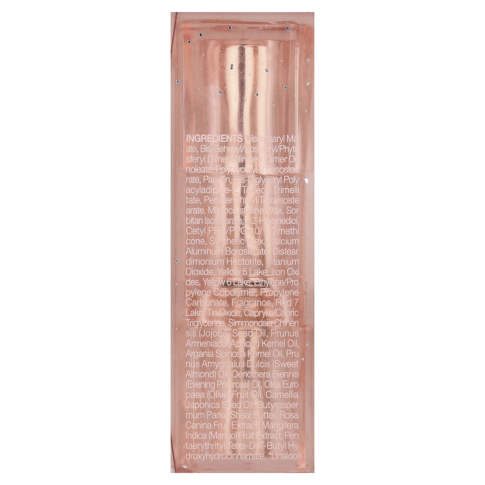 Диизостеарил малат, бис-бегенил/изостеарил/фитостерил димер дилинолеил димер дилинолеат, полиглицерил-2 триизостеарат, парафина, бис-диглицерил полациладипат-2, тридецил тримеллитат, пентаэритритил тетраизостеарат, микрокристаллический воск, изостеарат зобитана, 1,2-гександиол, цетил ПЭГ/ППГ-10/1 диметикон, синтетический воск, кальций алюминий боросиликат, дистеардимония гекторит, диоксид титана, краситель желтый 5 лак, оксиды железа, краситель желтый 6 лак, сополимер этилена/пропилена, пропиленкарбонат, отдушка, краситель красный 7 лак, оксид олова, каприловый/каприновый триглицерид, масло из семян жожоба (Simmondsia chinensis), масло из косточек абрикоса (Prunus armeniaca), масло арганы (Argania spinosa), масло сладкого миндаля (Prunus amygdalus dulcis), масло примулы вечерней (Oenothera biennis), оливковое масло (Olea europaea), масло из семян камелии японской (Camellia japonica), масло ши (Butyrospermum parkii), экстракт плодов шиповника (Rosa canina), экстракт плодов манго (Mangifera indica), пентаэритритил тетра-ди-т-бут гидроксигидроциннамат, линалоола.