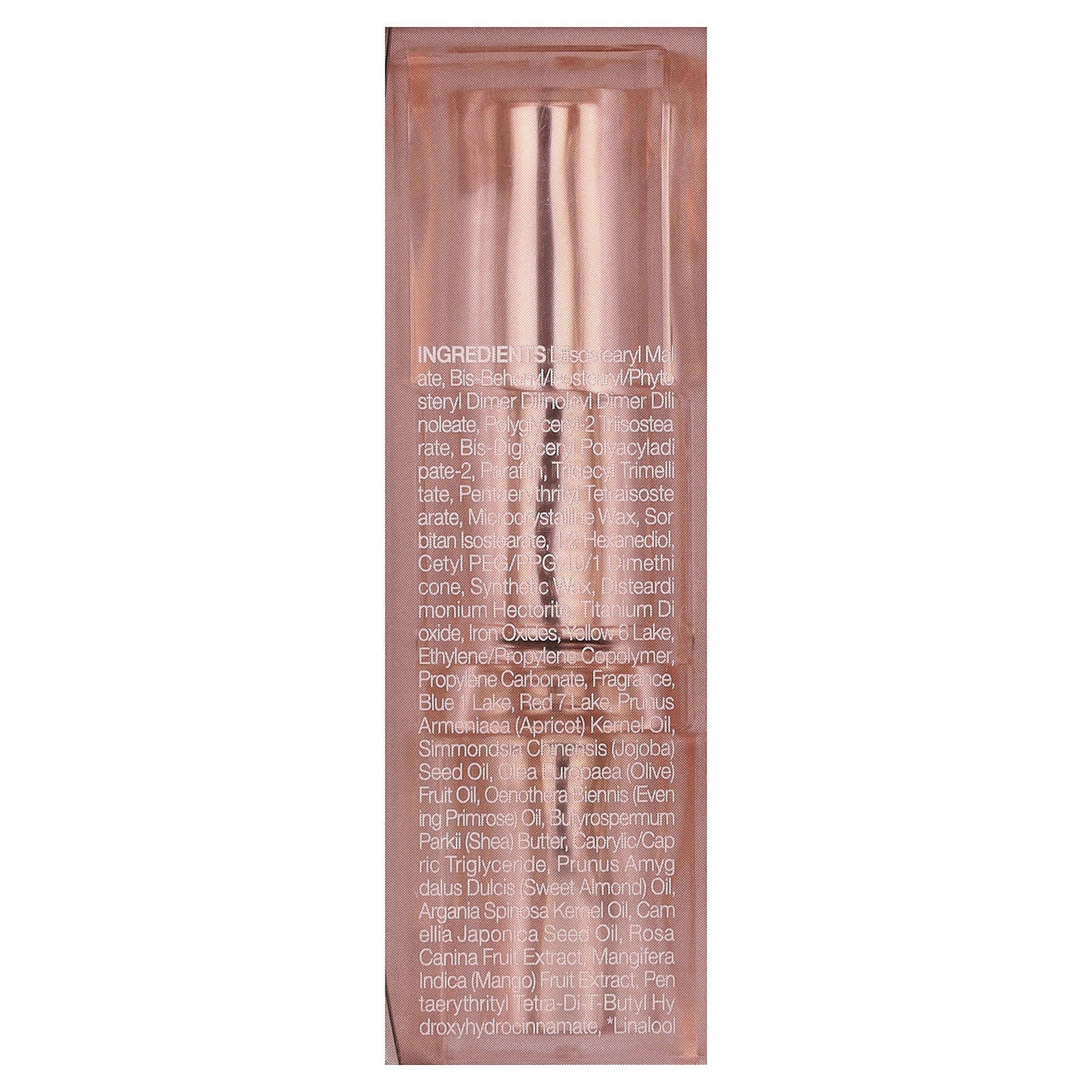 дистеарил малат, бис-бегенил/изостеарил/фитостерил димер дилинолеил димер дилинолеат, полиглицерил-2 триизостеарат, бис-диглицерил полиациладипат-2, парафина, тридецил тримеллитат, пентаэритритил тетраизостеарат, микрокристаллический воск, сорбитан изостеарат, 1,2-гександиол, цетил ПЭГ/ППГ 10/1 диметикон, синтетический воск, дистеардимония гекторит, диоксид титана, оксиды железа, краситель желтый 6 лак, сополимер этилена/пропилена, пропиленкарбонат, отдушка, краситель синий 1 лак, краситель красный 7 лак, масло из косточек абрикоса (Prunus armeniaca), масло из семян жожоба (Simmondsia chinensis), оливковое масло (Olea europaea), масло примулы вечерней (Oenothera biennis), масло ши (Butyrospermum parkii), каприловый/каприновый триглицерид, масло сладкого миндаля (Prunus amydalus dulcis), аргановое масло (Argania spinosa), масло из семян камелии японской (Camellia japonica), экстракт плодов шиповника (Rosa canina), экстракт плодов манго (Mangifera indica), пентаэритритил тетра-ди-трет-бутил гидроксигидроциннамат, линалоола.