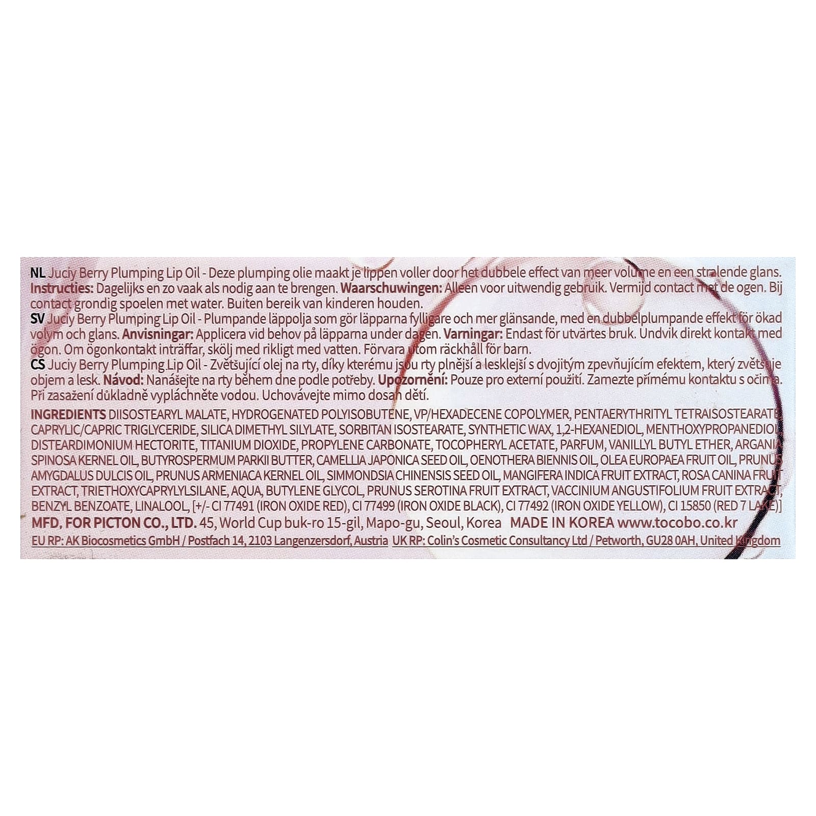 Диизостеарил малат, гидрогенизированный полиизобутен, ВП/гексадецен сополимер, пентаэритритил тетраизостеарат каприловый/каприновый триглицерид, диметил силилат диоксида кремния, сорбитан изостеарат, синтетический воск, 1,2-гександиол, ментоксипропандиол дистеардимония гекторит, диоксид титана, пропиленкарбонат, токоферилацетат, отдушка, ванилилбутиловый эфир, аргановое масло (Argani spinosa), масло ши (Butyrospermum parkii), масло из семян камелии японской (Camellia japonica), масло японской петрушки (Oenothera biennis), масло плодов оливы европейской (Olea europaea), масло сладкого миндаля (Prunus amygdalus dulcis), масло из косточек сливы (Prunus armeniaca), масло семян жожоба (Simmondsia chinensis), экстракт плодов мангиферы (Mangifera indica), экстракт плодов шиповника (Rosa canina), триэтоксикаприлилсилан, вода (Aqua), бутиленгликоль, экстракт плодов алычи (Prunus serotina), экстракт плодов голубики (Vaccinium angustifolium), бензилбензоат, линалоол, [+/-CI 77491 (красный оксид железа), краситель черный оксид железа (CI 77499), краситель желтый оксид железа (CI 77492), краситель красный 7 лак (CI 15850)].
