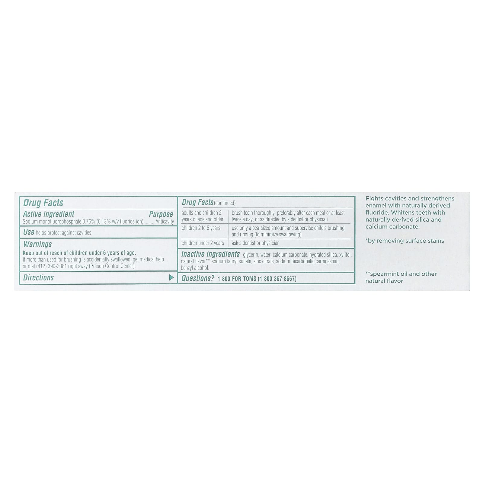 Fights cavities and strengthens enamel with naturally derived fluoride. Whitens teeth with naturally derived silica and calcium carbonate.
