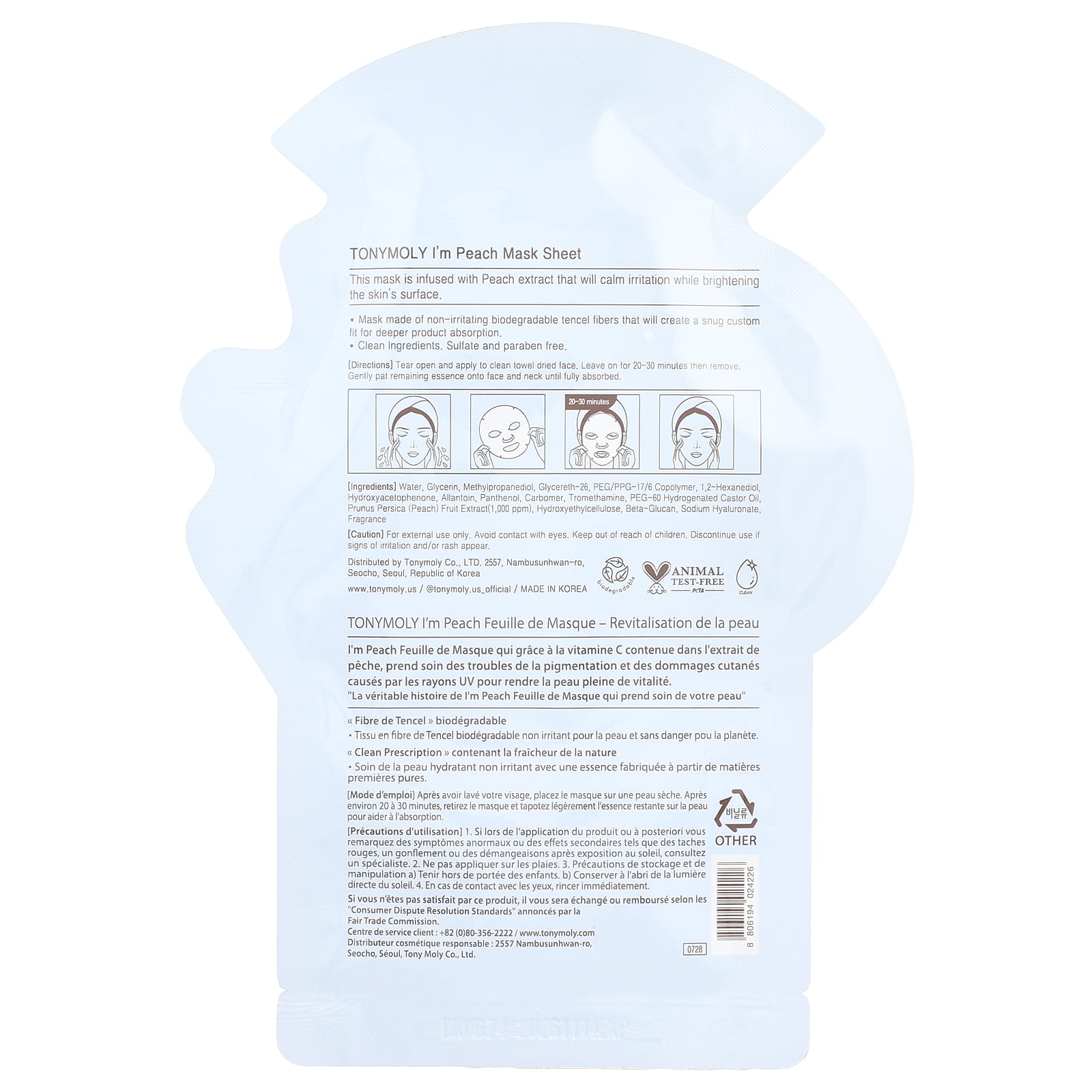 - Маска изготовлена из биоразлагаемых волокон Tencel, не вызывающих раздражения. Они обеспечивают плотное прилегание и более глубокое впитывание продукта.
