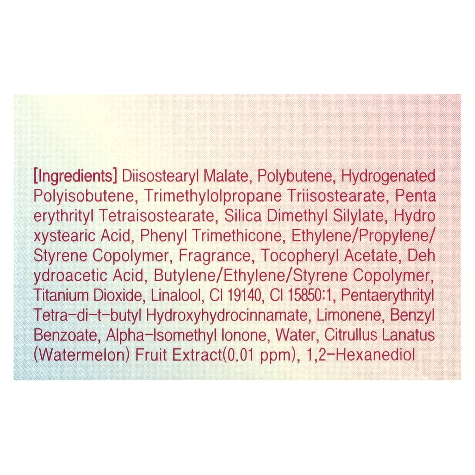 Диизостеарил малат, полибутен, гидрогенизированный полиизобутен, триметилолпропан триизостеарат, пентаэритритил тетраизостеарат, диметил силилат диоксида кремния, гидроксистеариновая кислота, фенилтриметикон, сополимер этилена/пропилена/стирола, отдушка, токоферилацетат, дегидроуксусная кислота, сополимер бутилена/этилена/стирола, диоксид титана, линалоол, CI 19140, ci 15850:1, пентаэритритил тетра-ди-трет-бутил гидроксигидроциннамат, лимонен, бензилбензоат, альфа-изометилионон, вода, экстракт плодов арбуза (Citrullus lanatus) (0,01 част. / млн), 1,2-гександиол.