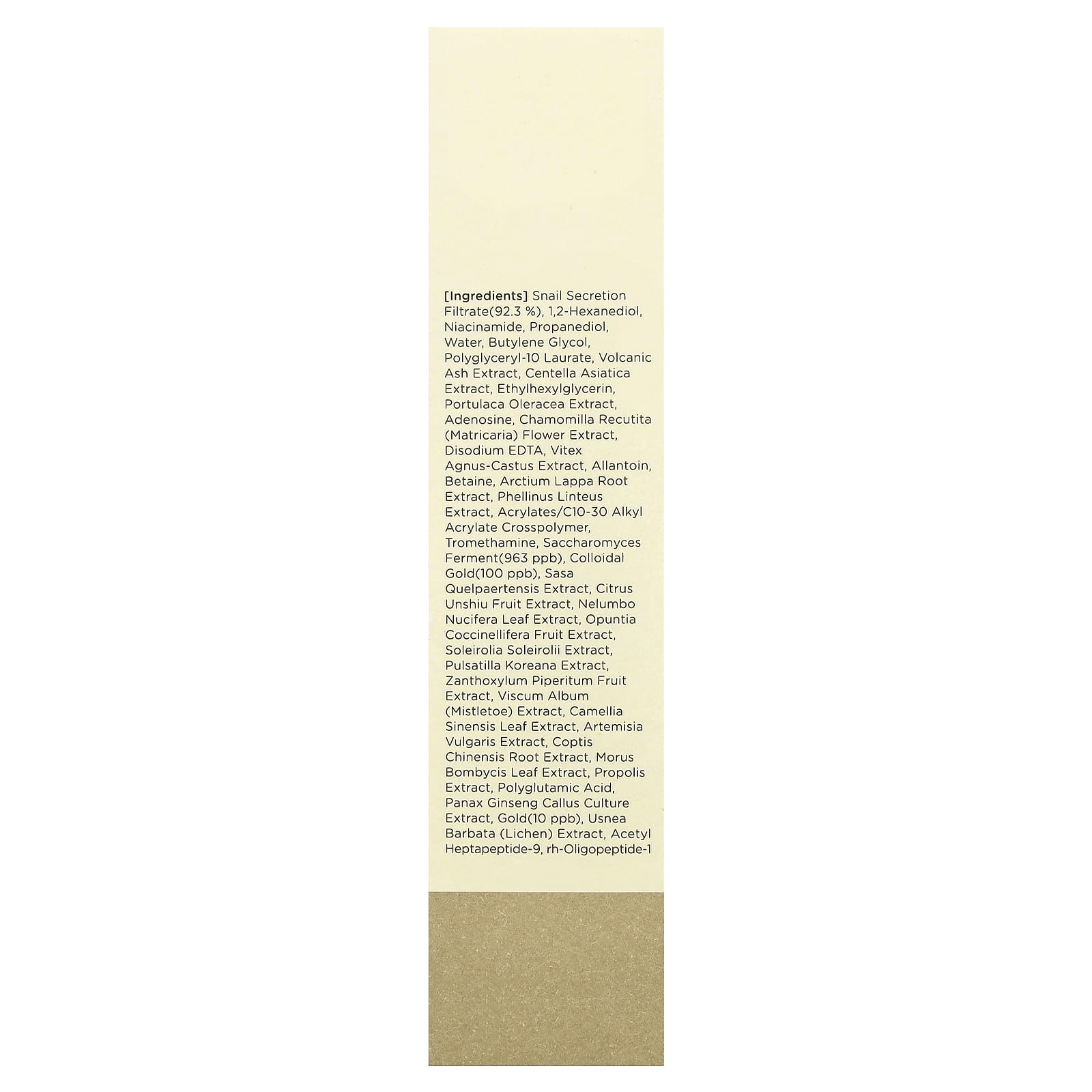 Фильтрат секрета улитки (92,3%), 1,2-гександиол, никотинамид, пропандиол, вода, бутиленгликоль, полиглицерил-10 лаурат, экстракт вулканического пепла, экстракт готу колы (Centella asiatica), этилгексилглицерин, экстракт портулака огородного (Portulaca oleracea), аденозин, экстракт цветков ромашки лекарственной (Chamomilla recutita), двунатриевая ЭДТК, экстракт витекса (Vitex agnus-castus), аллантоин, бетаин, экстракт корня лопуха (Arctium lappa), экстракт санхвана (Phellinus linteus), акрилат/c10-30 алкил акрилат кроссполимер, трометамин, Фермент сахаромицетов (963 част./млрд), коллоидное золото (100 част./млрд), экстракт бамбука (sasa quelpaertensis), экстракт плодов уншиу (Citrus unshiu), экстракт листьев лотоса орехоносного (Nelumbo nucifera), экстракт плодов опунции кошениленосной (Opuntia coccinellifera), экстракт солейролы (Soleiria roseirolii), экстракт корейской сон-травы (Pulsatilla koreana), экстракт сычуаньского перца (Zanthoxylum piperitum), экстракт омелы белой (Viscum album), экстракт листьев зелёного чая (Camellia sinensis), экстракт полыни (Artemisia vulgaris), экстракт корня сверции китайской (Swertia chinensis), экстракт листьев шелковицы (Morus bombycis), экстракт прополиса, полиглутаминовая кислота, экстракт каллусной культуры женьшеня обыкновенного (Panax ginseng), золото (10 част./млрд), экстракт лишайника (Usnea barbata), ацетил гептапептид-9, rh-олигопептид-1.