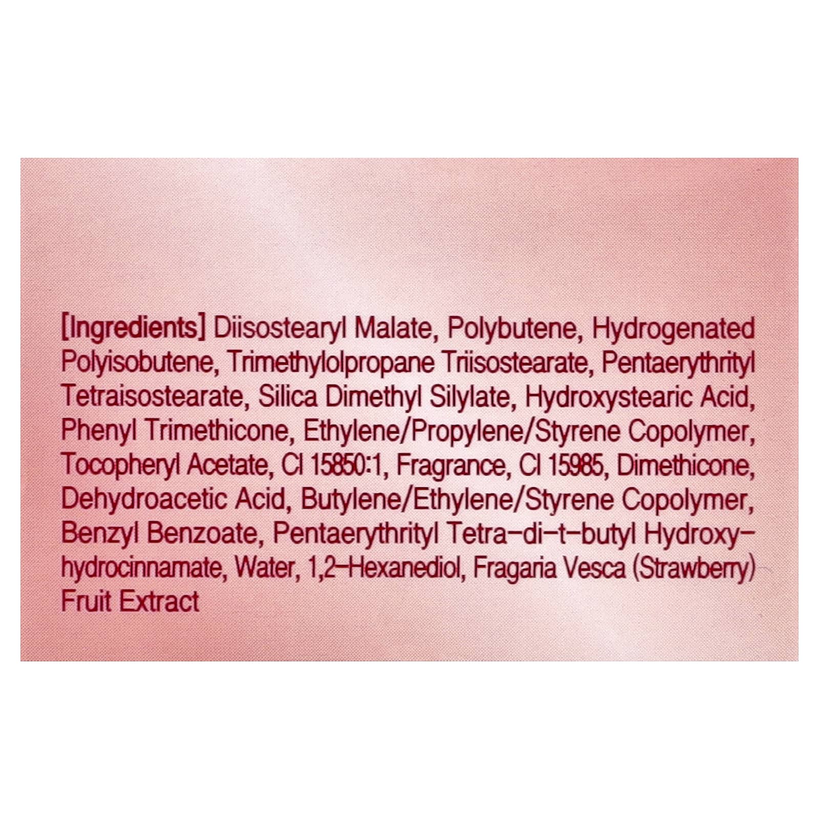 Диизостеарил малат, полибутен, гидрогенизированный полиизобутен, триметилолпропан триизостеарат, пентаэритритил тетраизостеарат, диметил силилат диоксида кремния, гидроксистеариновая кислота, фенилтриметикон, сополимер этилена/пропилена/стирола, токоферилацетат, CI 15850:1, отдушка, CI 15985, диметикон, дегидроуксусная кислота, сополимер бутилена/этилена/стирола, бензилбензоат, пентаэритритил тетра-ди-трет-бутил гидроксигидроциннамат, вода, 1,2-гександиол, экстракт клубники (Fragaria vesca).