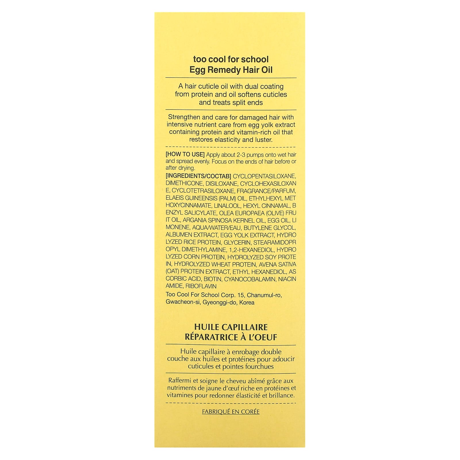 Циклопентасилоксан, диметикон, дисилоксан, циклогексасилоксан, циклотетрасилоксан, отдушка, пальмовое масло (Elaeis guineensis), этилгексил метоксициннамат, линалоол, гексил циннамал, бензилсалицилат, оливковое масло (Olea europaea), аргановое масло (Argania spinosa), яичное масло, лимонен, вода, бутиленгликоль, экстракт альбумина, экстракт яичного желтка, гидролизованный рисовый протеин, глицерин, стеарамидопропил диметиламин, 1,2-гександиол, гидролизованный кукурузный белок, гидролизованный соевый протеин, гидролизованный протеин из пшеницы, экстракт овсяного протеина (Avena sativa), этил гександиол, аскорбиновая кислота, биотин, цианокобаламин, никотинамид, рибофлавин.