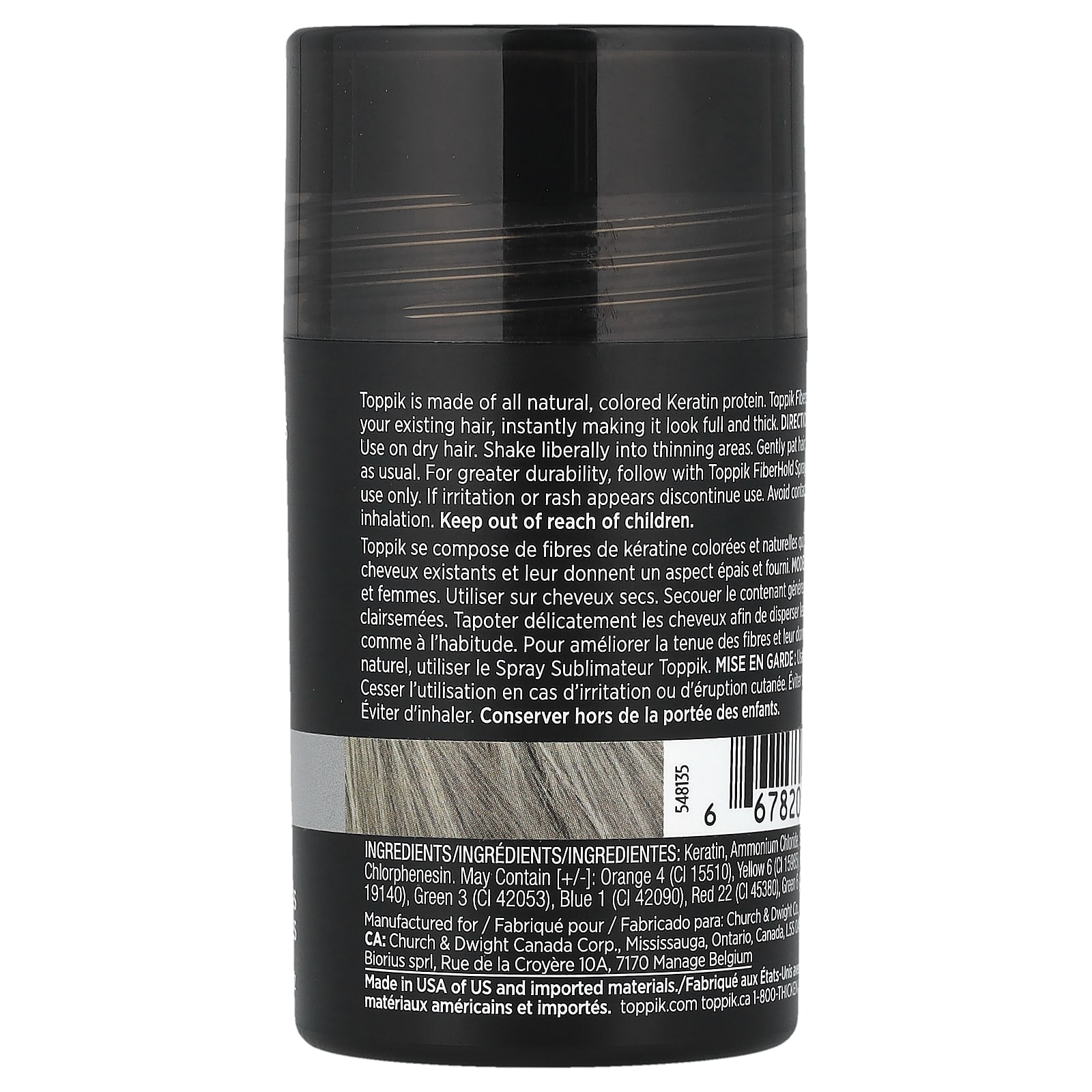 Toppik изготовлен из полностью натурального окрашенного кератина. Волокна Toppik незаметны для существующих волос, мгновенно делая их объемными и густыми.